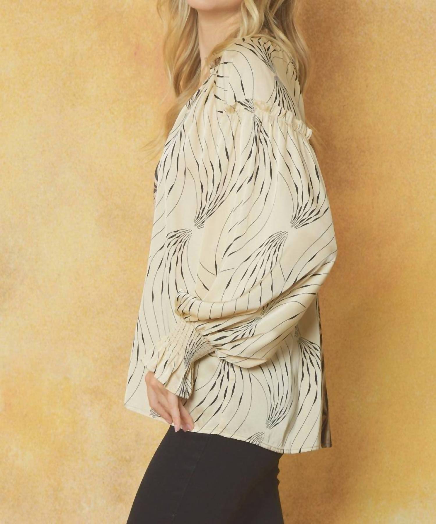 A versatile blouse that works from desk to dinner! Top Has A V-Neckline Featuring Covered Button Front Closure. Blouse Has Long Sleeves With Smocked Ruffle Cuffs. Top Is A Loose Fit That Is Unlined, Woven, Non-Sheer And Lightweight. A Blouse That Does Double Duty, Wear To Work During The Day And At Night Pair With Leather Or Black Denim. Fabric: 100% Polyester. Model Is 5'10" And Wearing Size Small.