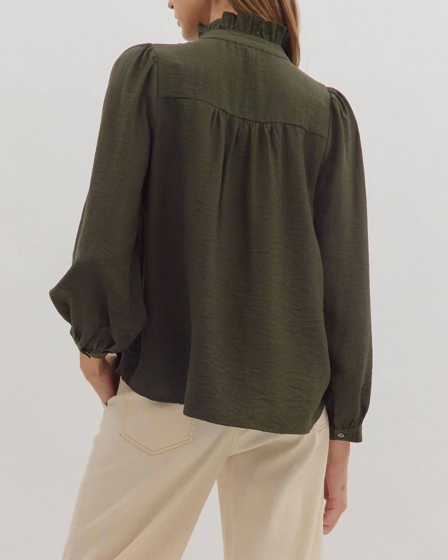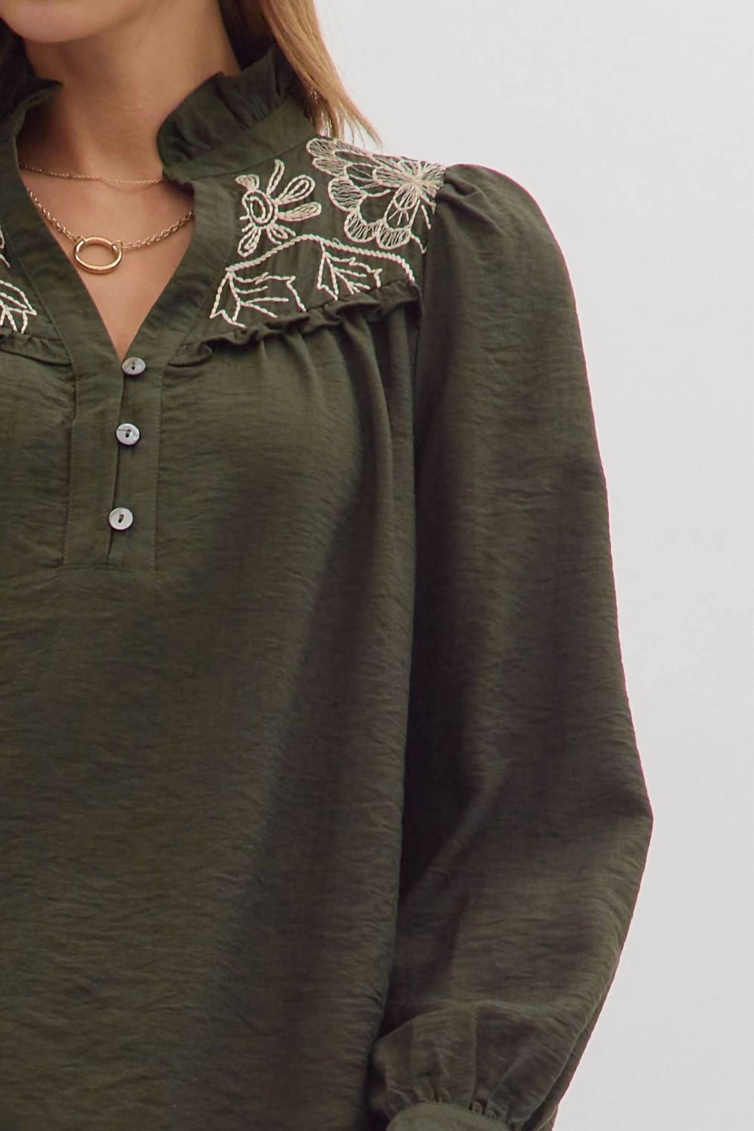 A timeless blouse that will never go out of style. Charming olive blouse perfect for elevating your wardrobe. Long-sleeve piece features a floral embroidered collar and ruffle trim, with a partial button placket and cuffed sleeves for an elegant touch. Composed 85% Rayon, 15% Nylon. Button closure. Machine wash cold on a gentle cycle, line dry, cool iron if needed. Model is 5’10” and wearing a size Small, ideal for pairing with your favorite denim or trousers for a polished look.