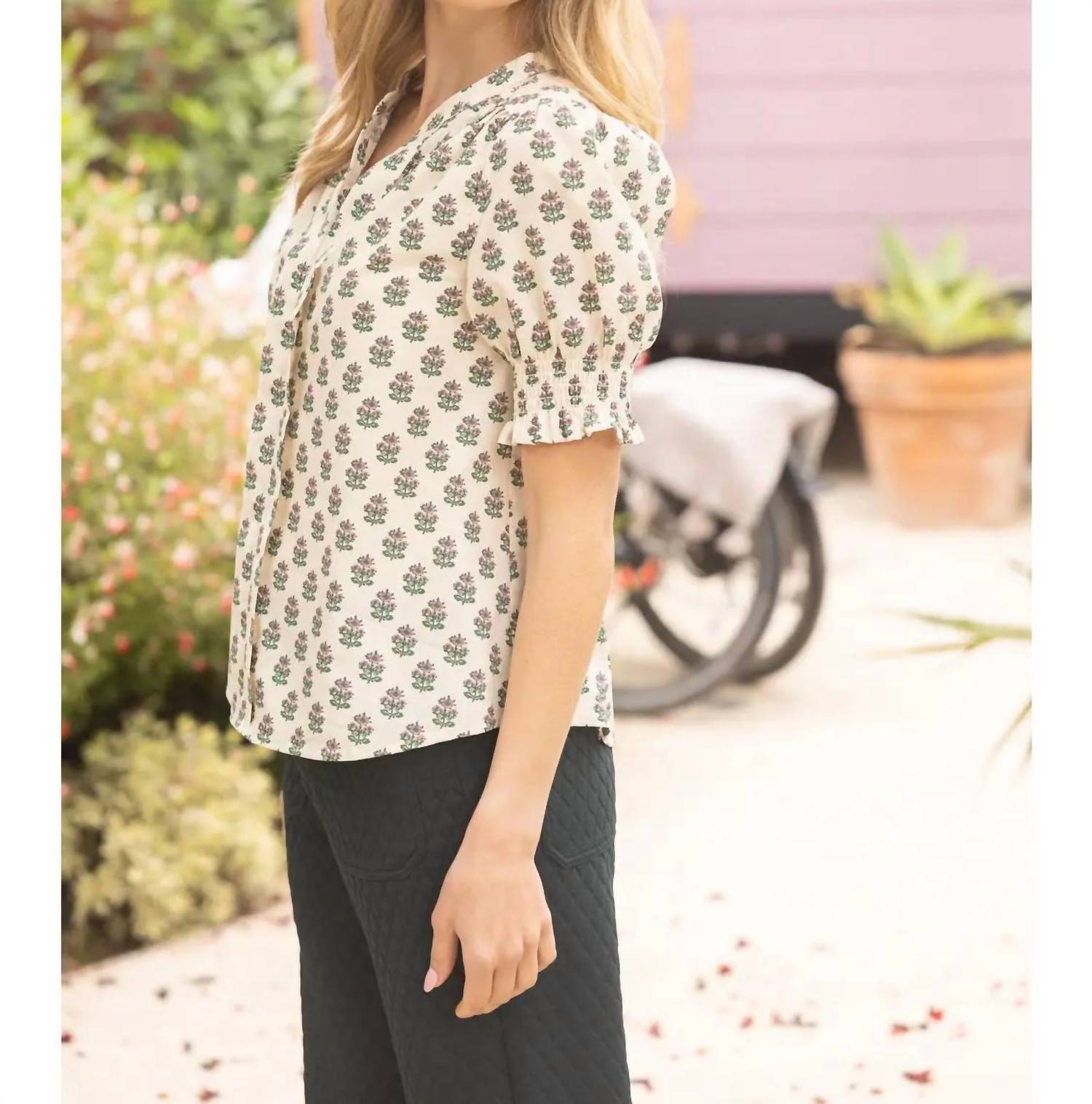 Embrace springtime in style with the Emery Smocked Puff Sleeve Top by Entro, showcasing a whimsical white floral pattern perfect for holiday parties. This women's tee features short smocked puff sleeves and a flattering v-neckline for a chic appearance. With a pull-on closure and effortless charm, it seamlessly enhances your wardrobe essentials. Care instructions recommend machine washing for convenience.