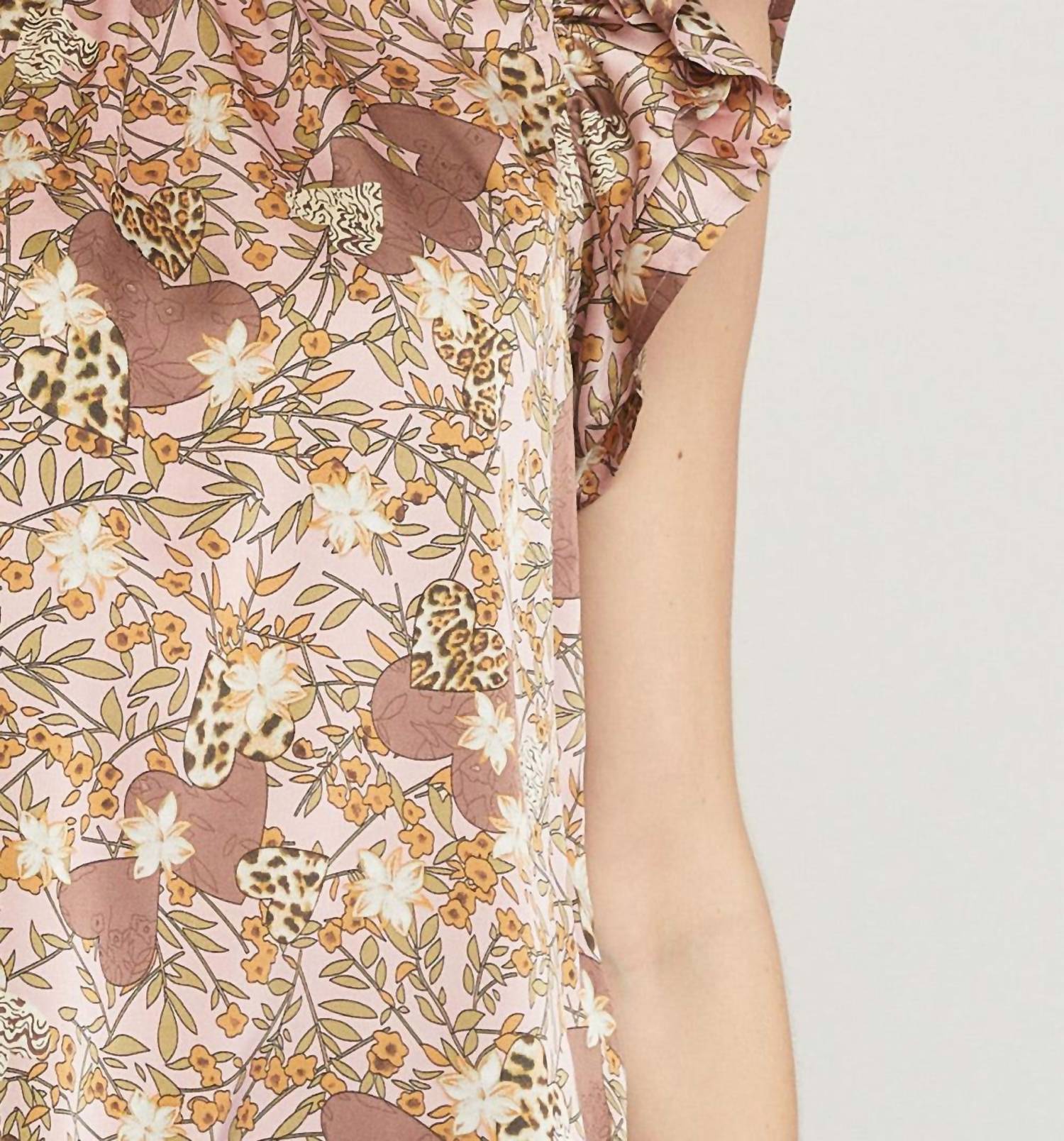 A timeless blouse that will never go out of style. Introducing the Floral & Leopard Ruffle Top by Entro in a chic mauve hue. This blouse showcases cap ruffle layered sleeves and a mockneck with elegant ruffle detail. Made from 100% polyester, its silky satin fabric features a captivating floral, heart, and leopard print. The top offers a button keyhole closure at the back and an A-line silhouette for a flattering fit. Sizes range from Small (Bust 36", Length 26") to 2X (Bust 50", Length 30"). Care instructions include hand wash or dry clean.