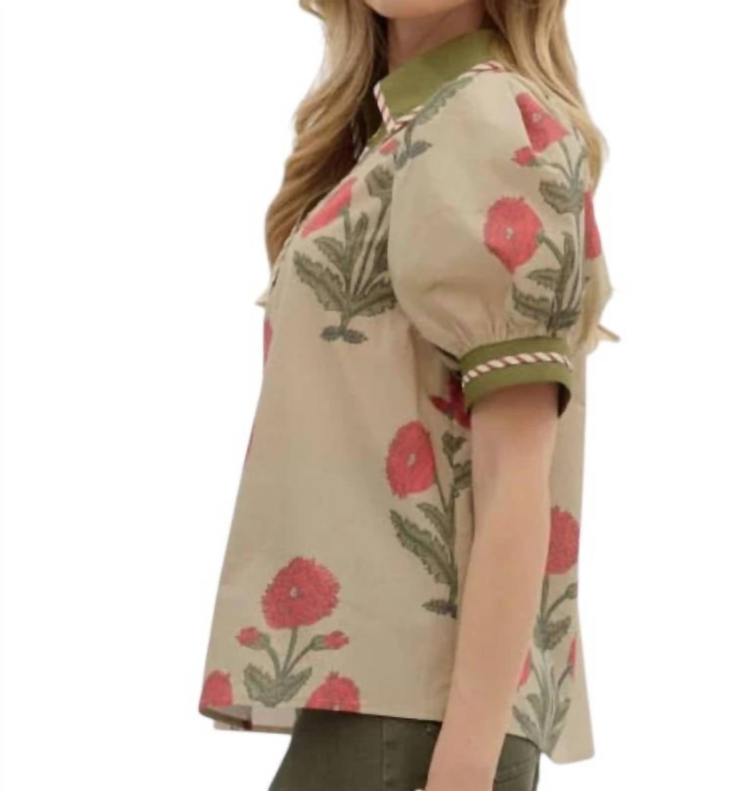 A timeless blouse that will never go out of style. Introducing the Floral Print Bubble Sleeve Top by Entro, a stunning summer essential in Beige Multi. This lightly woven piece features short bubble sleeves and a contrasting V-neck collar with binding inset details. Made from 100% cotton, it's perfect for vacation or Mother's Day celebrations. With a simple pull-on closure and designed to be unlined and non-sheer, it's both stylish and comfortable. Care for this piece by hand washing and line drying. Model is 5'10" and is wearing a size Small.