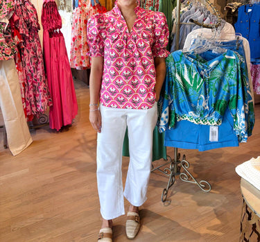Discover the Floral Scallop Motif Top by Entro, an elegant piece in vibrant pink that is sure to make a statement. This blouse comes with short sleeves and a charming v-neck, showcasing a playful floral pattern with delicate scallop detailing. It offers a convenient pull-on closure for ease and comfort. Care: Machine wash. Perfect for women looking to elevate their style at summer holiday parties.
