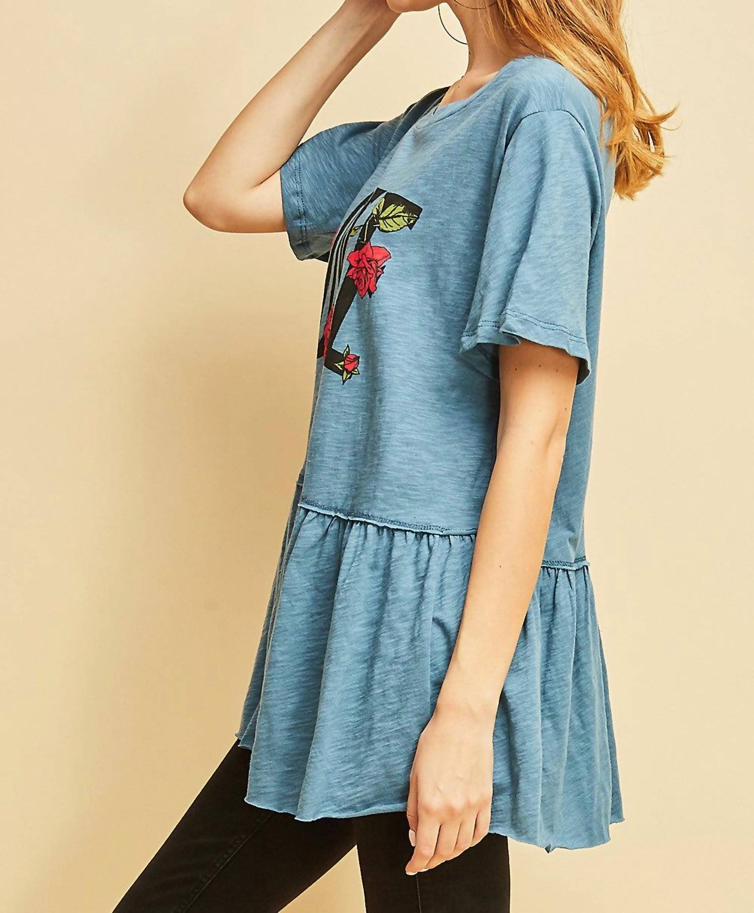 Introducing the Love Graphic Peplum Top by Entro, a stylish addition to any wardrobe with its vibrant blue hue and playful "love" graphic print. This short-sleeve tee is crafted from 100% cotton, ensuring a lightweight and breathable wear. Made in the USA, it features a flattering peplum hem and a classic scoop neck design, making it an effortless choice for casual outings. Closure: Pull-on. Care instructions: Hand wash cold.