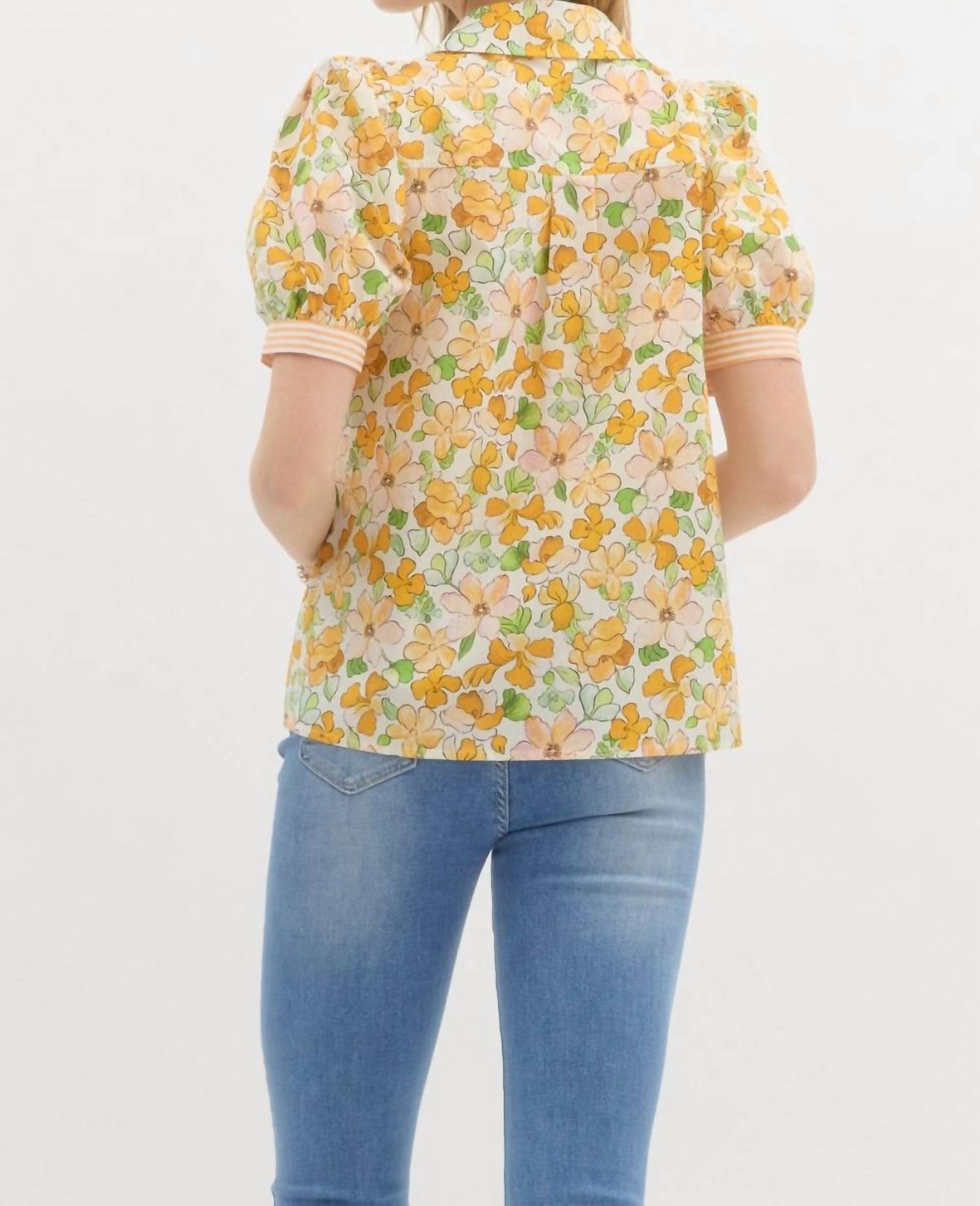 Presenting the Molly Floral V-neck Blouse by Entro in a refreshing gold floral print. This blouse features short stripe puff sleeves and a stylish collar with a split v-neck. Composition: 100% Cotton. Closure: Front button closure. Care: Hand wash. Model is 5'10" wearing a size small. Perfect for any spring occasion, including Mother's Day events and church outings.