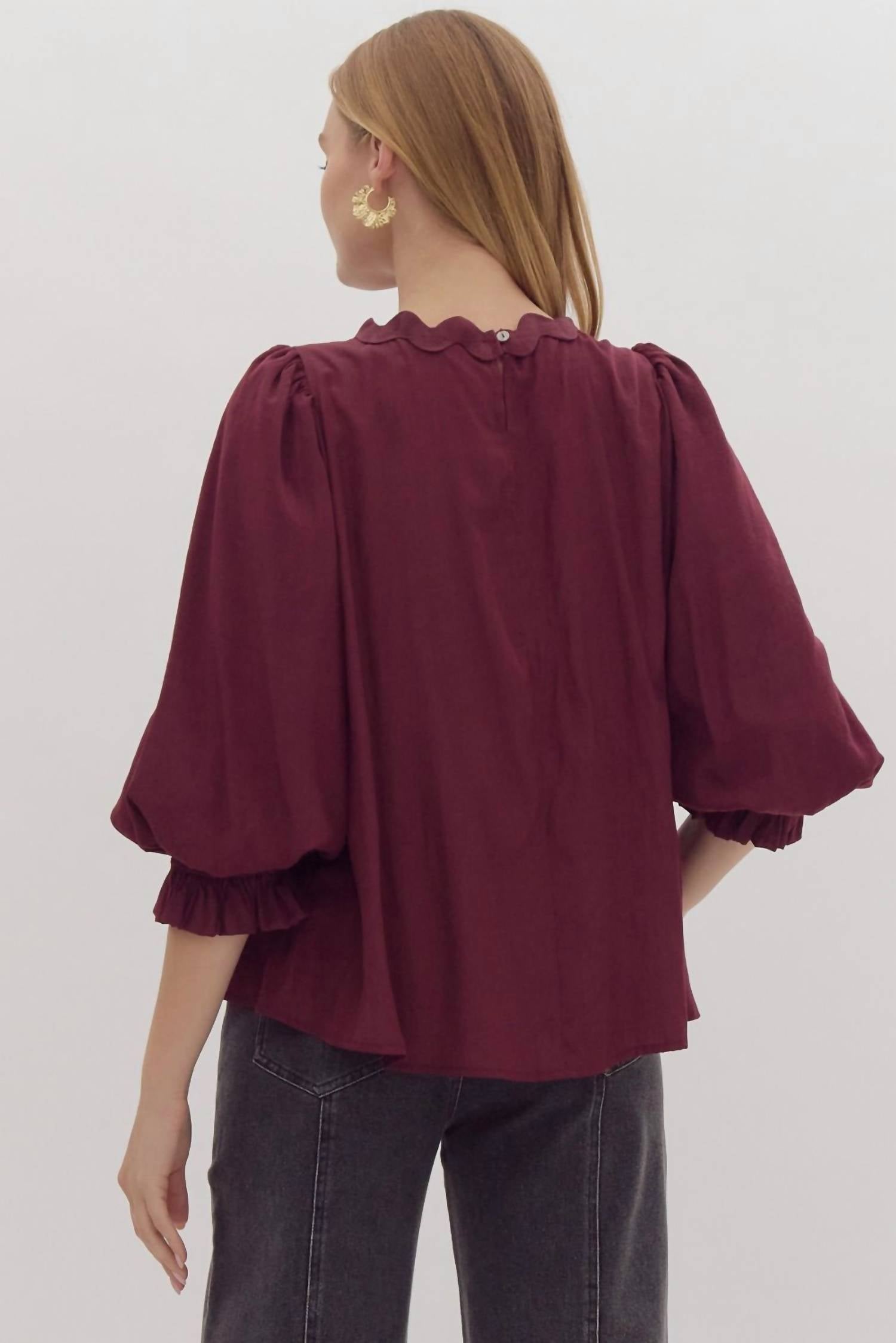 Features three-quarter balloon sleeves and a charming ric rac trim around the crewneck, offering a relaxed fit perfect for any occasion. Crafted from 60% Rayon and 40% Polyester. Designed in a stylish zigzag pattern, ideal for adding a touch of 90s fashion to your wardrobe. Button closure. Hand wash.
