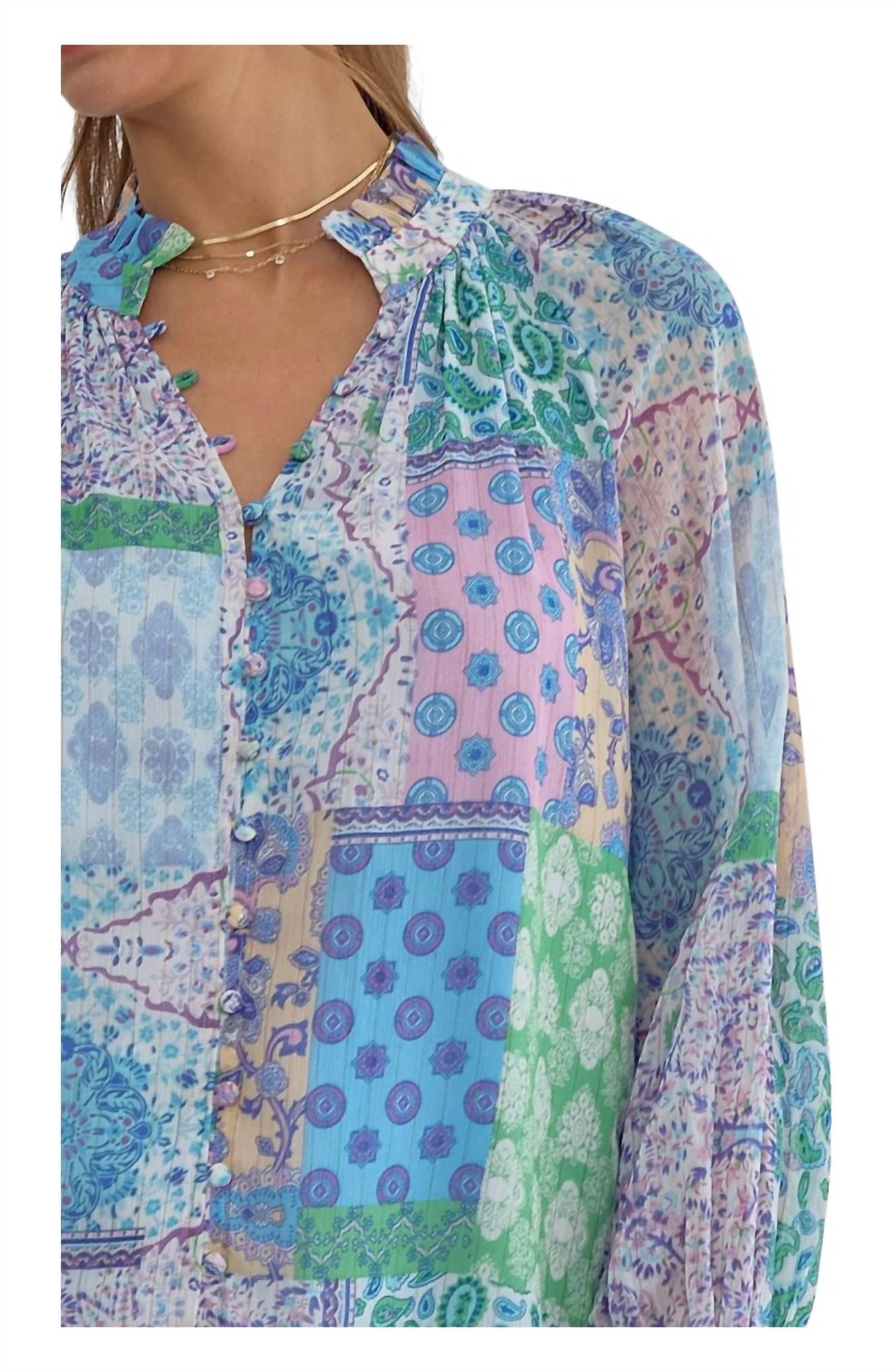 A timeless blouse that will never go out of style.Patchwork Print. Long Sleeves. V-Neckline. Covered Button Closure. Lines & Woven. Lightweight & Non-Sheer. True To Size. 100% Polyester.