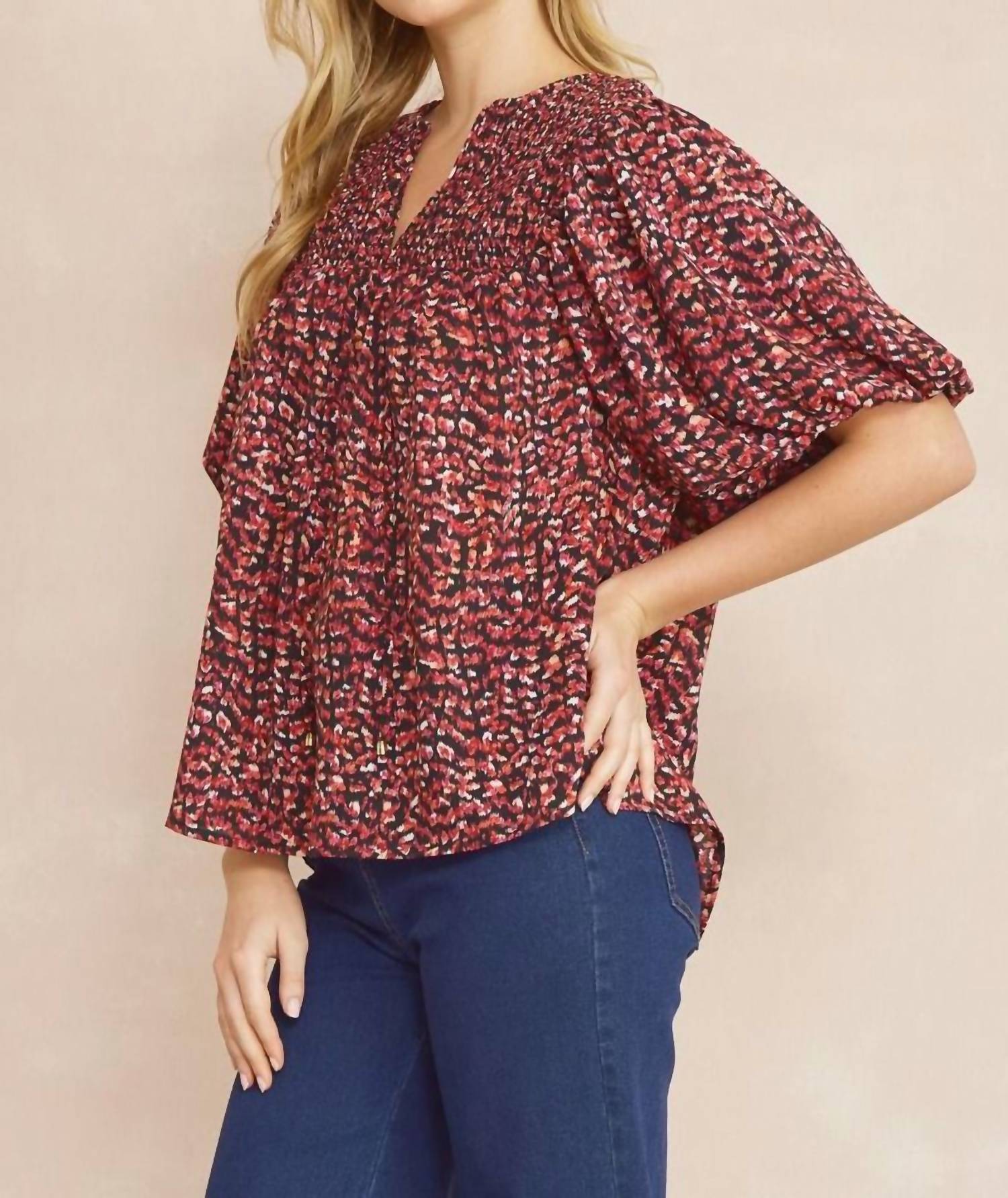 Elevate your evening ensemble with Entro's Print Bubble Top in a sophisticated plum hue. This V-neck blouse features short bubble sleeves and a self-tie front for added flair. It's lined and crafted from 100% Polyester, embracing both style and comfort. With a convenient pull-on closure, this top requires hand washing and is best line dried to maintain its look.