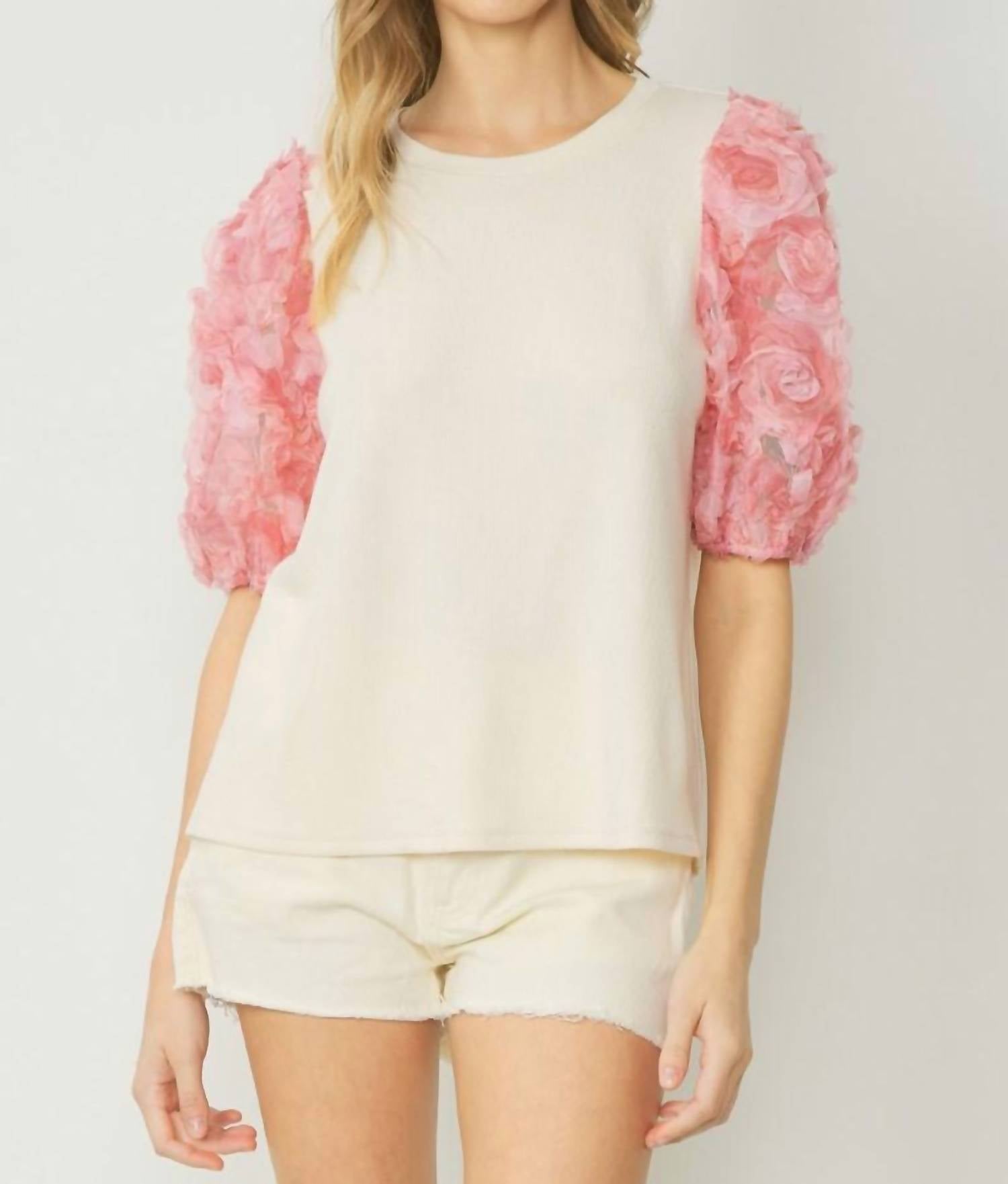 Entro - Ribbed 3d Floral Sleeved Top