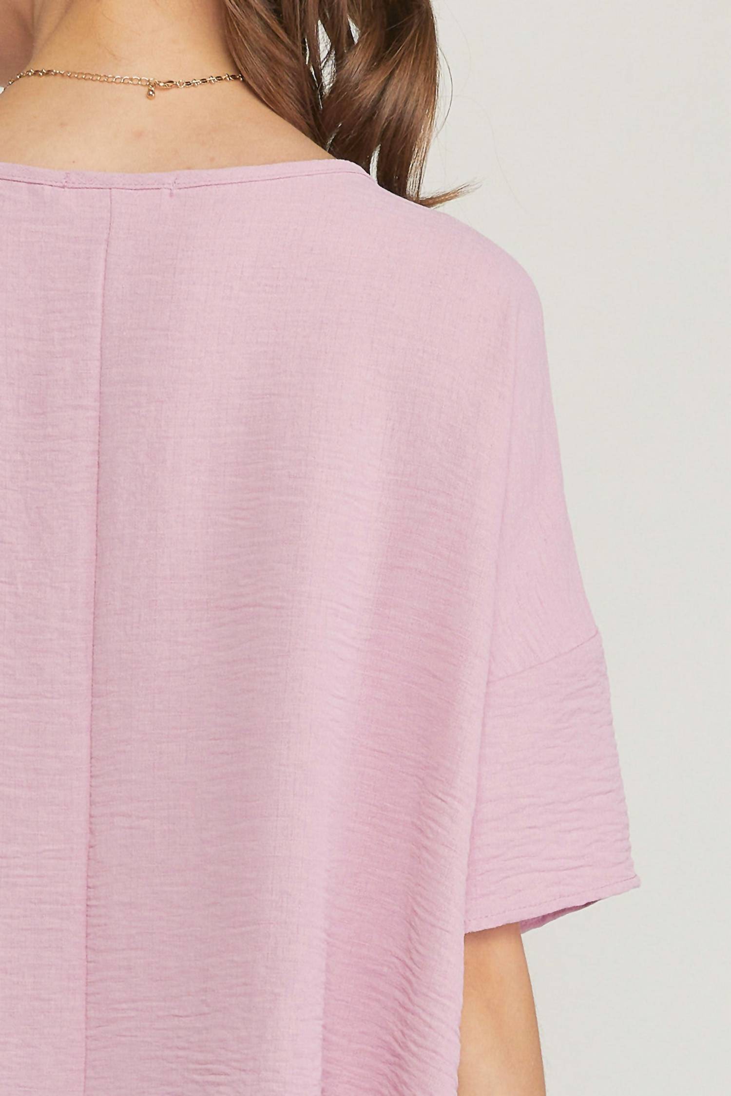 Meet the Round Neck Babydoll Top by Entro, your go-to for effortless style in charming orchid pink. This blouse showcases short sleeves with dropped shoulders and a playful oversized babydoll a-line silhouette, offering a flattering fit across its sizes. Crafted from 100% polyester and made in the USA, it features a convenient pull-on closure. Care: Hand wash or dry clean. Sizes from Small to 2X available, with bust measurements ranging from 46" to 60" and length from 24" to 30".