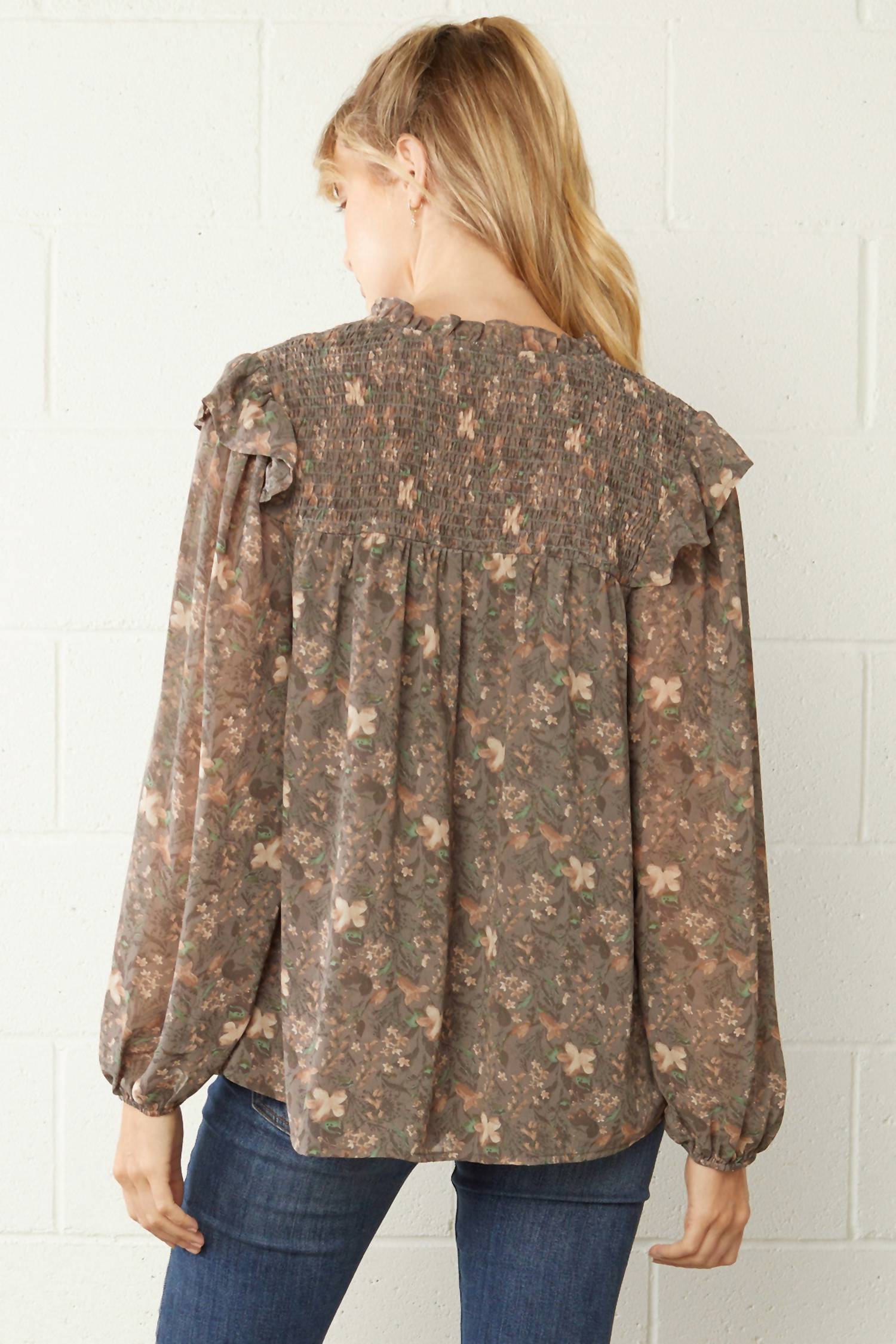 Embrace effortless style with the Ruffle & Floral Blouse by Entro, a chic piece perfect for both work and play. This charcoal blouse showcases a pretty floral print with long sheer sleeves featuring elastic at the wrist and ruffle detailing at the neckline. Made from 100% polyester, this imported top has a split V-neckline with a tie closure and is fully lined. It boasts a relaxed silhouette with smocking on the shoulder area. Care for it by hand washing or dry cleaning. Available sizes come with a bust of up to 46" and a consistent length of 26".