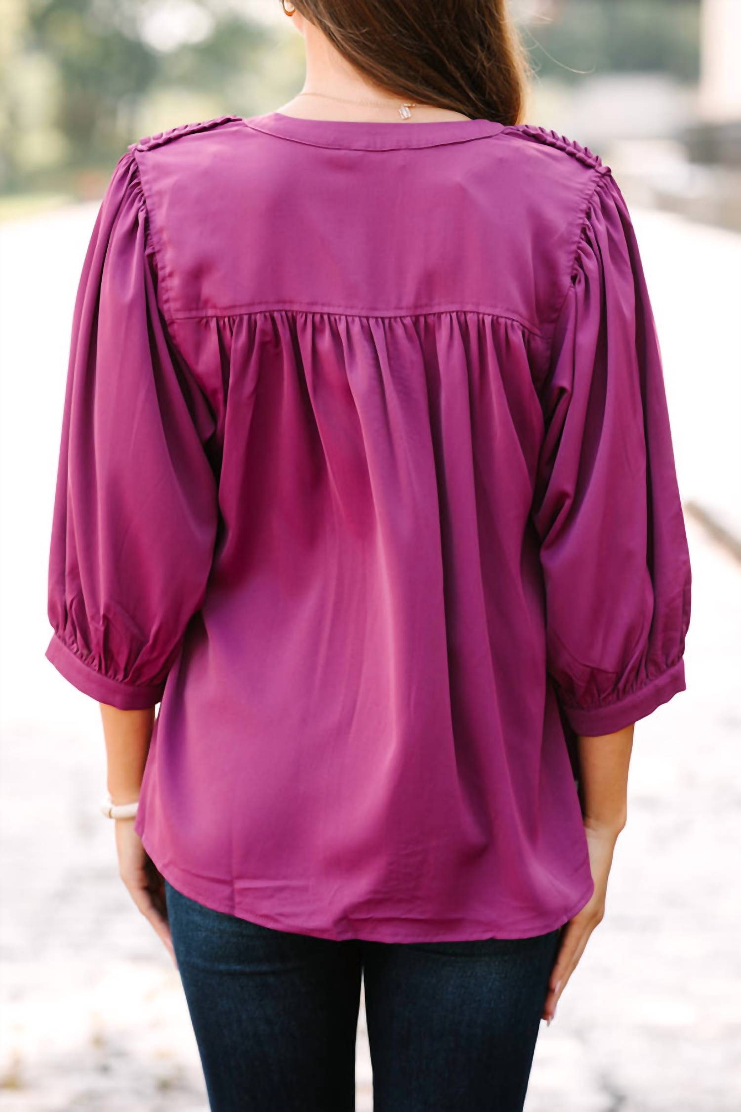 Introducing the Ruffle V-Neck Blouse with Braided Hem by Entro in a rich Plum hue, a stunning addition to any wardrobe. This women’s blouse features three-quarter sleeves and a stylish v-neck design. Crafted from 100% Polyester, it boasts a unique braided texture along the front seam and shoulders. Closure is a convenient pull-on style, making it easy to wear and perfect for effortless elegance in purely solid patterns.