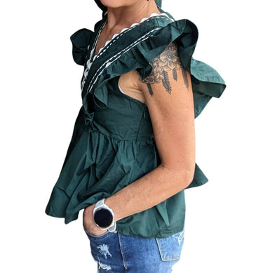This Ruffled Blouse is a cap sleeve top featuring a scalloped trim and a V-neckline. It includes a side zip closure and is made from lightweight woven fabric for comfort, making it suitable for any occasion.