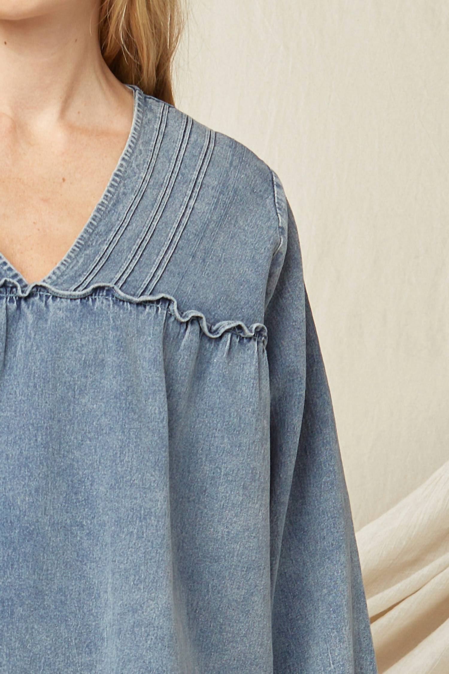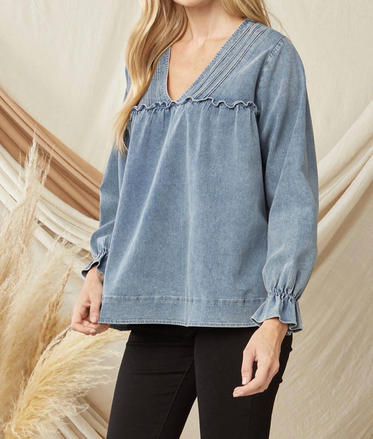 Introducing the Ruffled V-neck Top by Entro, a chic denim blouse designed with a feminine touch. Featuring long sleeves with elastic and a ruffle at the wrist, this oversized A-line silhouette is crafted from 100% cotton for a soft, stretchy fit. Closure type: Pull on. Care: Hand wash or dry clean. Perfect for achieving a stylish, comfortable look this spring.