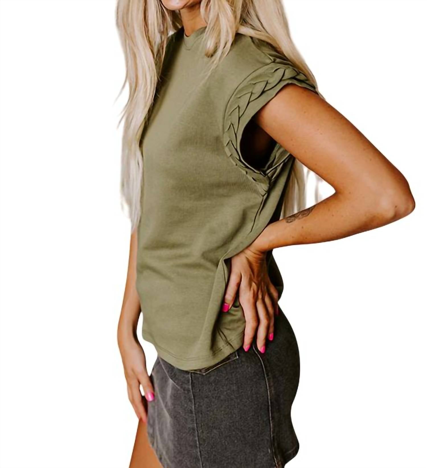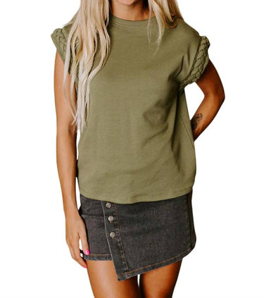 The short sleeve tee you'll want in every color. Introducing the Short Sleeve Braided Twist Top by Entro, a chic addition to your summer wardrobe in an elegant olive hue. This women's crewneck tee features short sleeves and a unique braided detail at the cuff, crafted from a comfortable 84% Cotton 16% Polyester blend. Closure is pull-on, enhancing its minimalist design perfect for holiday parties. Enjoy the effortless style and comfort it brings to any occasion.