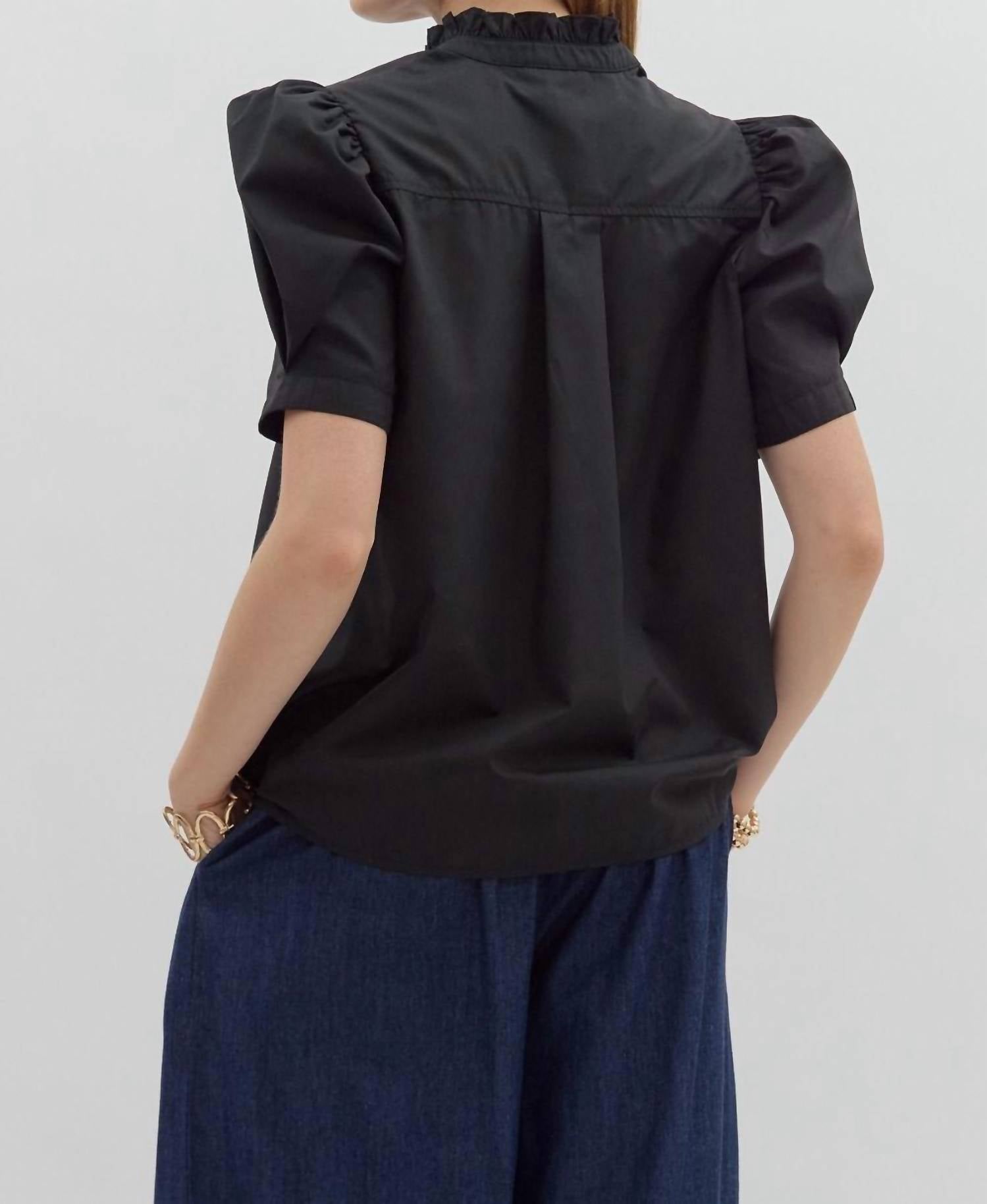 Meet your new favorite vacation piece: the Short Sleeve Puff Shoulder Top by Entro, crafted for style and comfort. This women's top is made from a blend of 65% polyester and 35% cotton and features a lightweight, woven design in classic black. The puff shoulder short sleeves and ruffle band collar add a touch of flair, while the button front closure ensures a perfect fit. For easy care, simply machine wash and tumble dry as needed.
