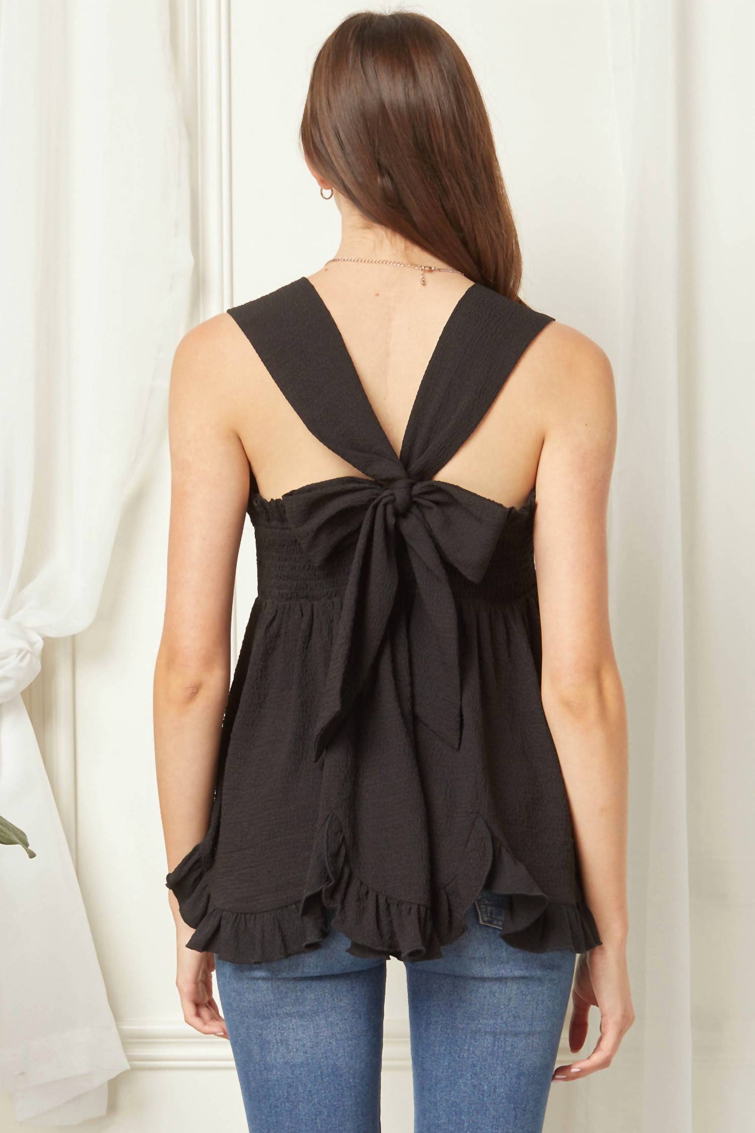The Entro Square Neck Babydoll Top in timeless black is a charming addition to any women's evening wardrobe. With its sleeveless design, squared neckline, and wide straps, it offers a playful and feminine silhouette. Crafted from 100% lightweight polyester, it includes a smocked back with an adjustable tie closure for a perfect fit. Measuring 30 inches in length for all sizes, this imported top requires hand washing and line drying to maintain its minimalist style.