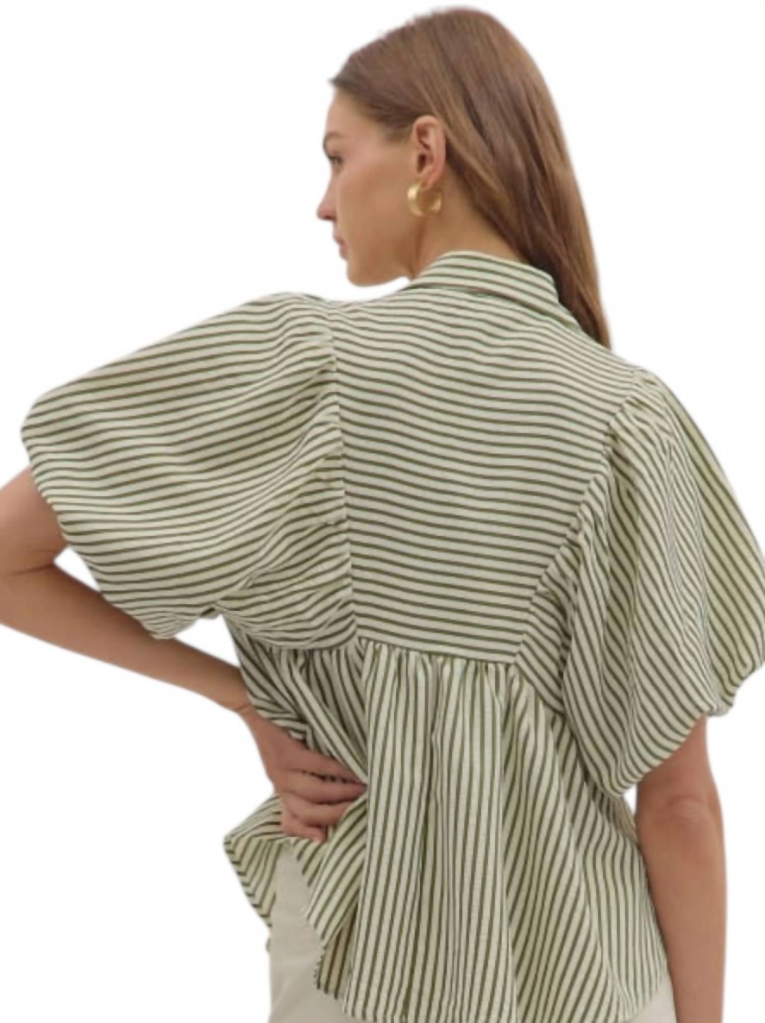 Introducing the Stripe Short Sleeve Smocked Dolman Sleeve Top by Entro, a perfect addition to your summer wardrobe. This green blouse boasts short dolman sleeves and a stylish V-neckline, exuding both elegance and comfort. Crafted from 100% polyester in a lightweight, woven fabric, it's perfect for sophisticated vacation outings. With a convenient pull-on closure, this top should be hand washed and laid flat to dry to maintain its polished look. Model is 5'10" and wearing a size Small.