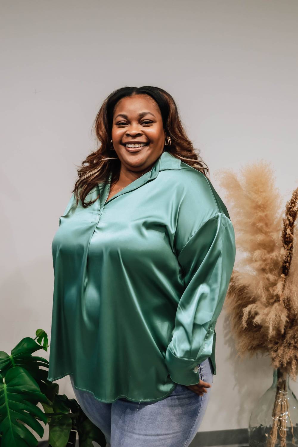 Experience the opulence of the Sweet Dream Blouse Plus by Entro, a sophisticated Seafoam top that radiates elegance. Crafted from luxurious satin, this piece features a collared V-neck and long sleeves with button closures, perfect for a dinner party or New Year's Eve celebration. Elevate your spring wardrobe with its lightweight and non-sheer woven fabric that offers both comfort and chic style. Embrace effortless style and timeless 90s fashion with this solid-patterned, collar-neck blouse.