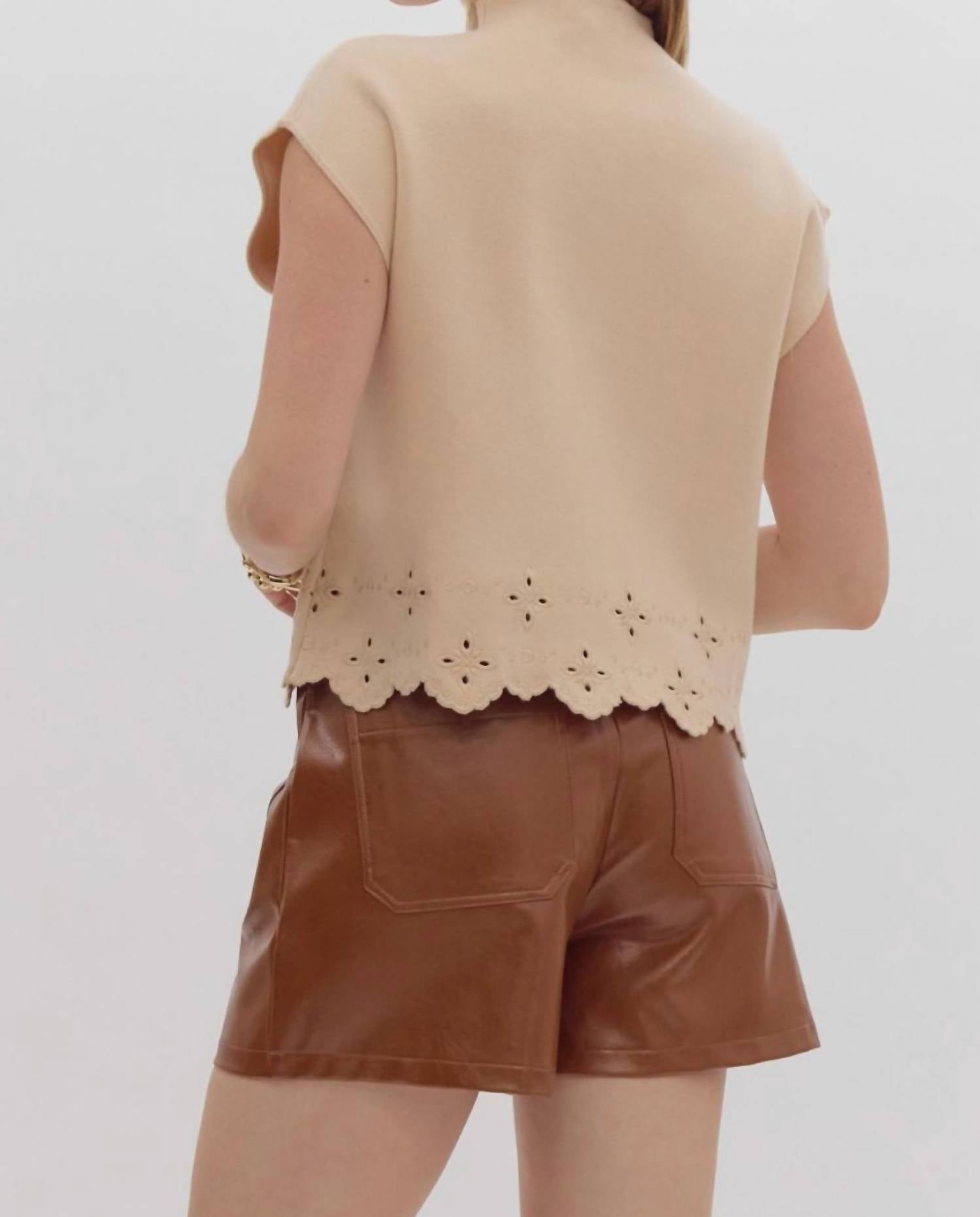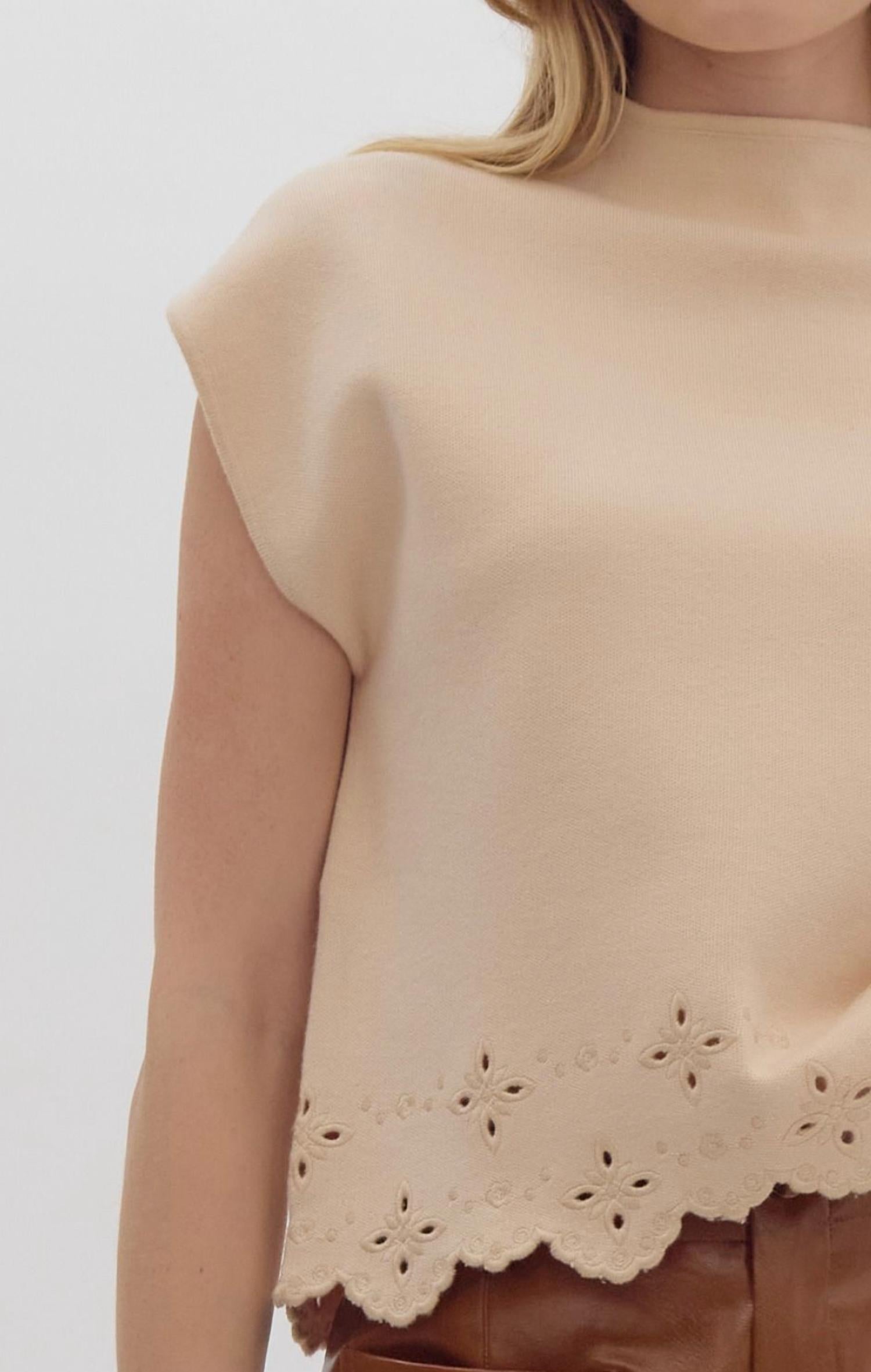 This mockneck sweater features a textured design with intricate laser cut and embroidered details. Composition: 50% Viscose, 30% Polyester, 20% Nylon. Closure: Pull on. Perfect for those seeking a touch of sweetness without the fuss of pockets.