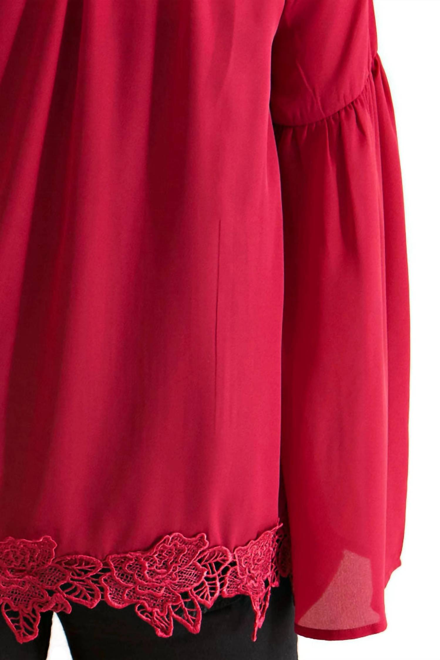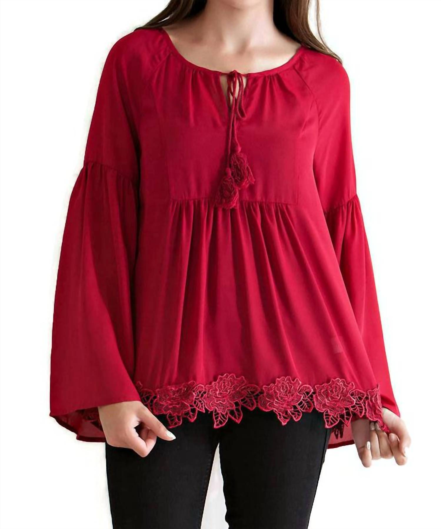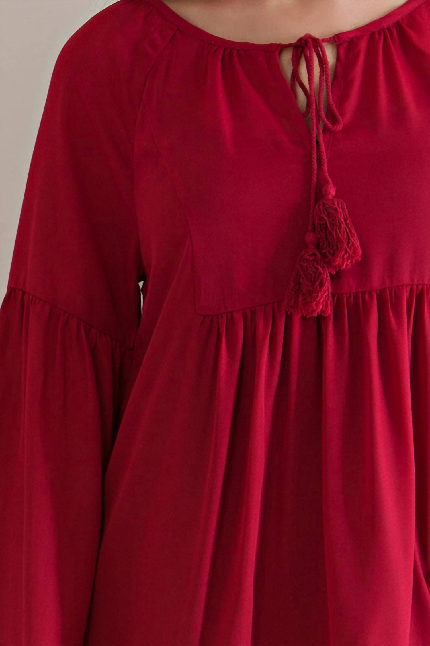 Discover the Tassel Tie Babydoll Blouse by Entro, a bohemian-inspired piece in vibrant red that exudes effortless chic. Featuring long bell sleeves and an A-line babydoll silhouette, this blouse is made entirely of lightweight and semi-sheer 100% Polyester. With a pull-on closure and a garment length of 25 inches, it is perfect for minimalist spring occasions or a holiday party. Care for this beautiful piece by hand washing in cold water.