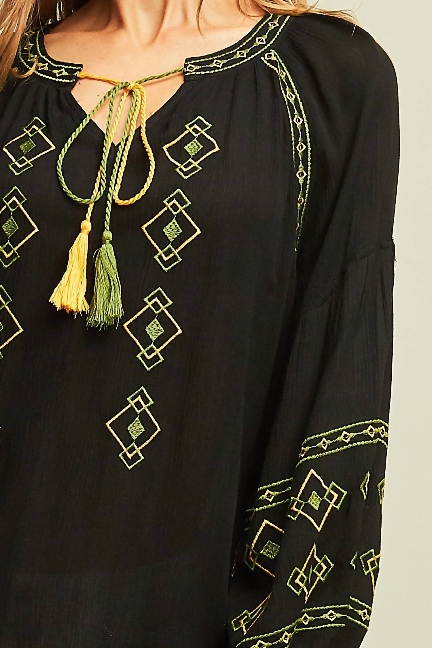 Introducing the Tassel Tie Peasant Blouse by Entro, a chic and vibrant addition to your wardrobe. This black blouse showcases long balloon sleeves with elastic at the wrist and colorful embroidery, offering a stylish pop against a crinkled lightweight fabric. Composition: 100% Rayon. Closure: Pull-on style with a split V-neckline and tassel ties. Care: Hand wash or dry clean.