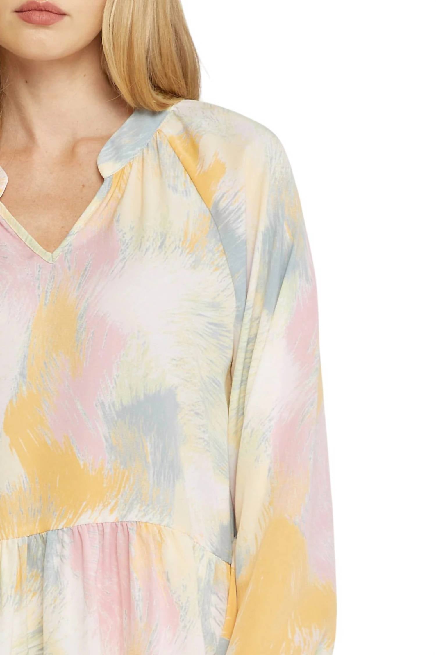 This blouse features a V-neckline, long sleeves with elastic at the wrist, tiered detailing, a pretty pastel print, and an A-line silhouette. Made from 100% polyester. Length: 27" (regular size), 31" (plus size). Hand wash or dry clean.