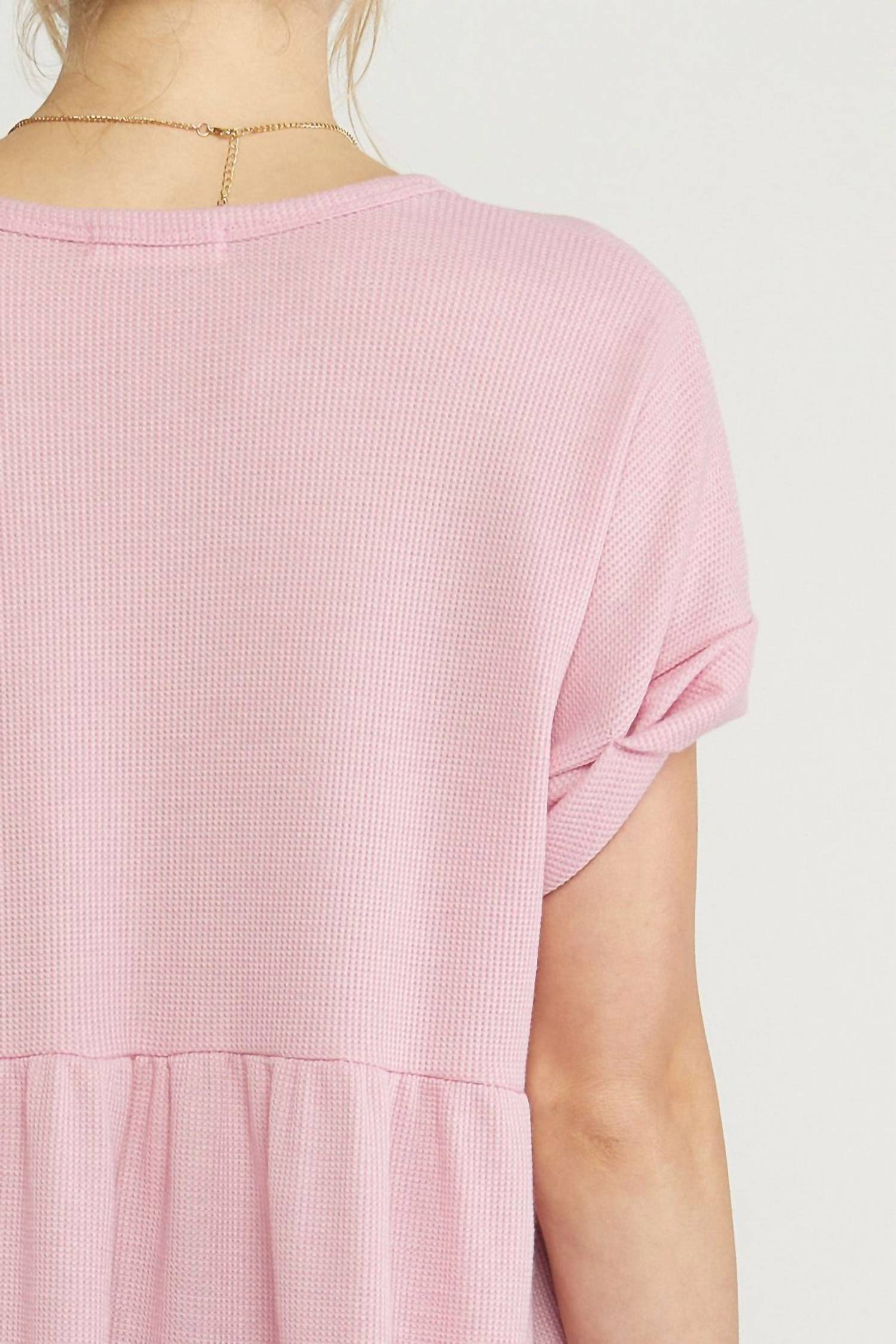 It features a V-neckline with three buttons, short twisted sleeves, is made from a light weight mini waffle knit fabric and has a flattering a-line flowy oversized babydoll silhouette. Small: Bust 42" Length 28", Medium: Bust 44 Length 28". Large: Bust 46" Length 28", XL: Bust 52" Length 29". 1X: Bust 54" Length 29", 2X: Bust 56" Length 29". 85% Polyester, 10% Rayon, 5% Spandex. Soft stretchy fabric. Hand wash or dry clean. Made in the USA.