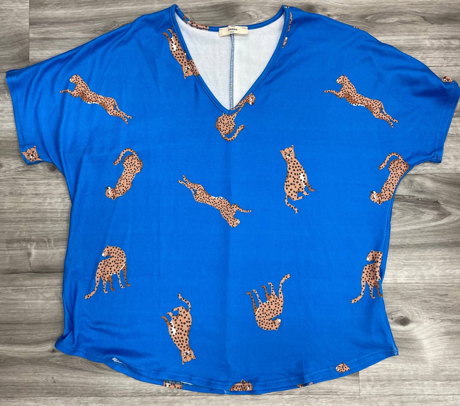 Pair this crop top with your favorite high-waisted jeans or maxi skirt. Introducing the Women's Cheetah Top by Entro in a vibrant Cobalt Blue graphic print, perfect for adding a pop of style to your wardrobe. This short sleeve, v-neck top features a drop shoulder design, offering both comfort and a modern edge. Composition: 96% Polyester, 4% Spandex. Closure: Easy pull-on style. With its lightweight knit fabric, this top is ideal for those seeking a fashionable yet comfortable piece.