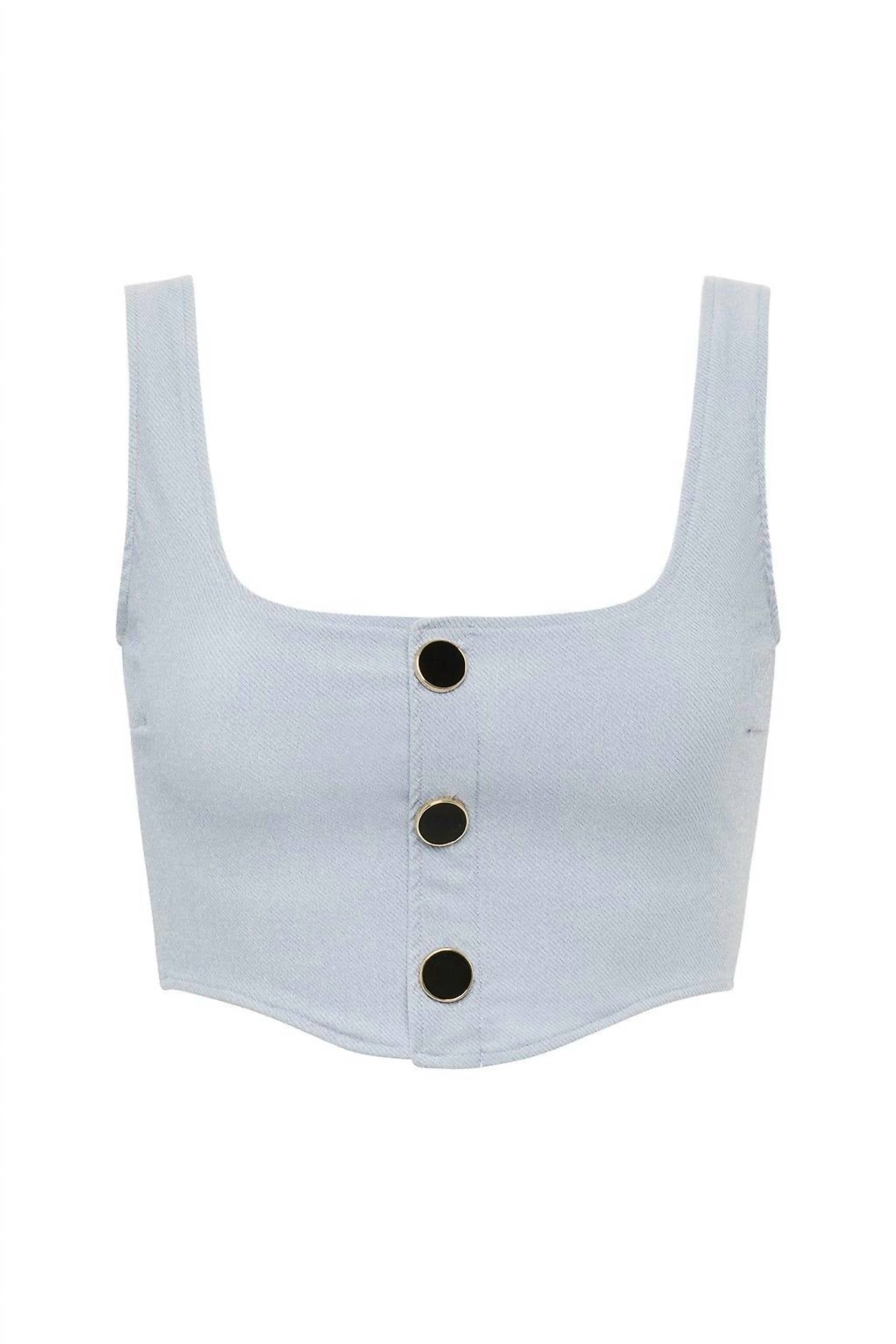 Pair this crop top with your favorite high-waisted jeans or maxi skirt. Elevate your style with the Olivia Corset Top by Montce, a stunning light denim piece perfect for any vacation wardrobe. This sleeveless crop top features a flattering square neckline and a pull-on faux button-up design, providing medium support with thick straps for added comfort. Crafted from an Italian-imported fabric with moderate stretch, the top is composed of a sustainable 60% Nylon, 30% Polyester, and 10% Spandex blend. Closure is achieved with a button closure, and it requires hand washing to maintain its minimalist elegance.