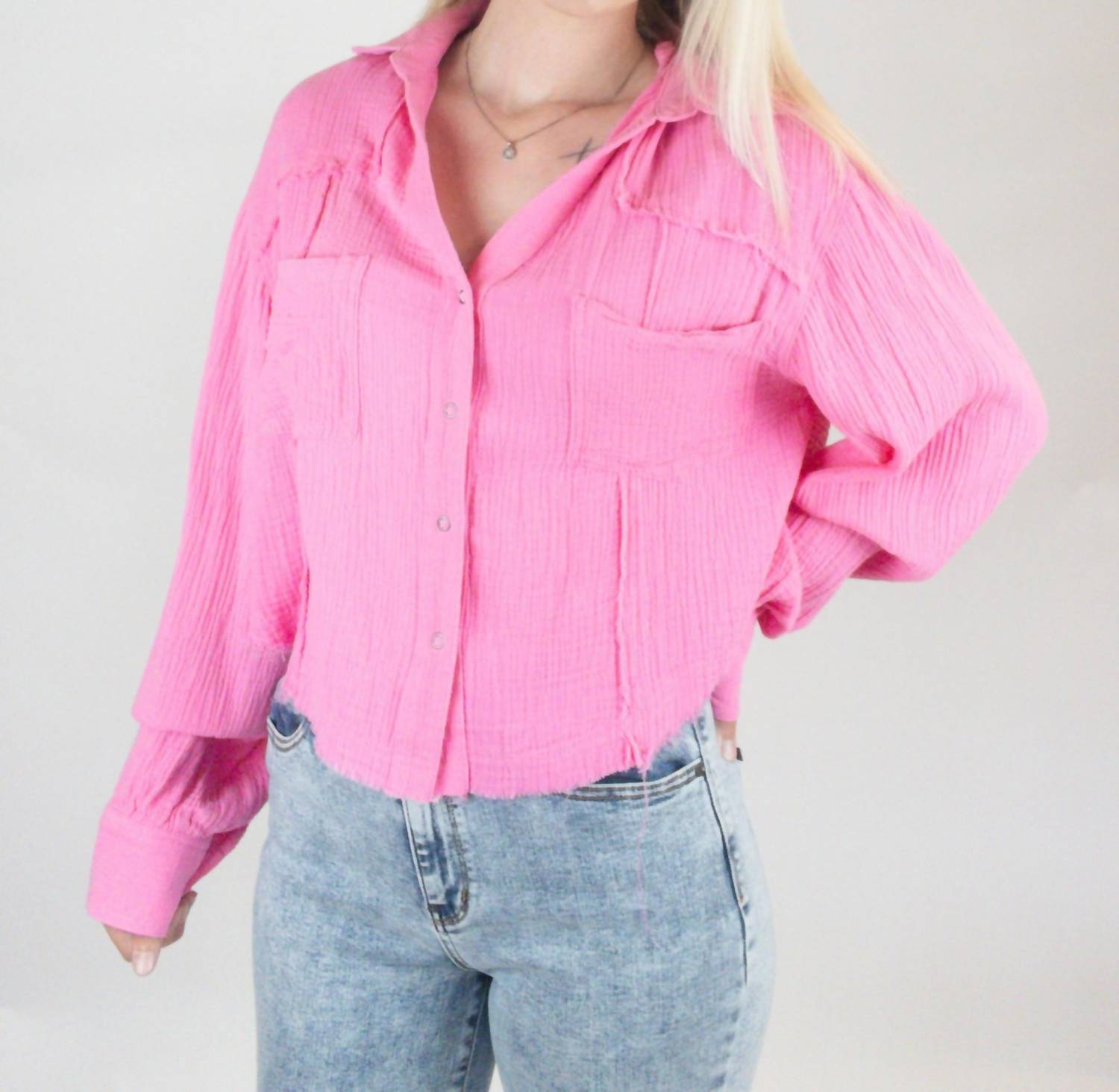 Vibrant addition to any wardrobe in a bright pink hue. Crafted from a comfortable blend of 75% cotton and 25% polyester, offering a delightful lightness with its fun cropped hemline. Perfect for travel and festive occasions, features a classic collar neckline and a convenient button closure. Care instructions specify hand washing to maintain its playful charm.