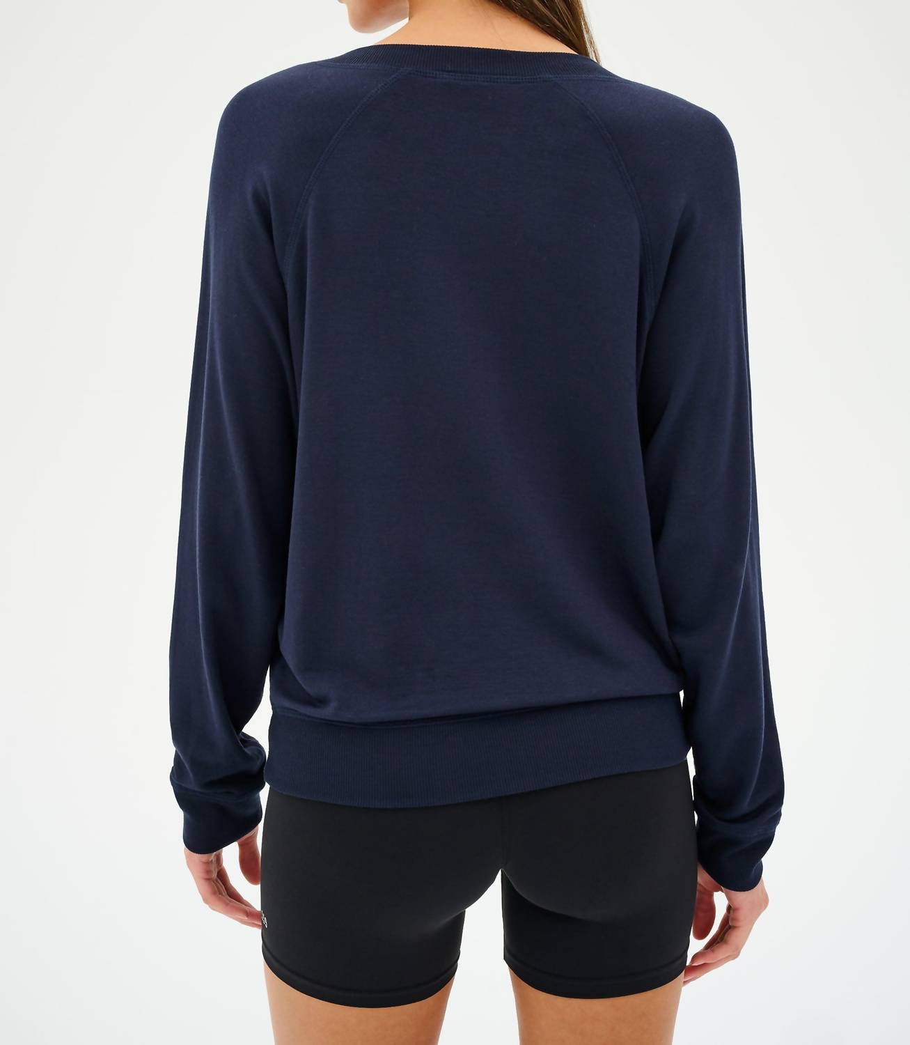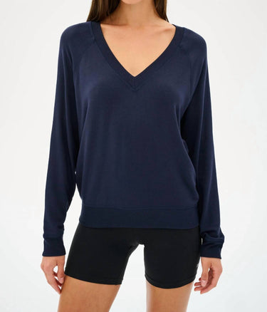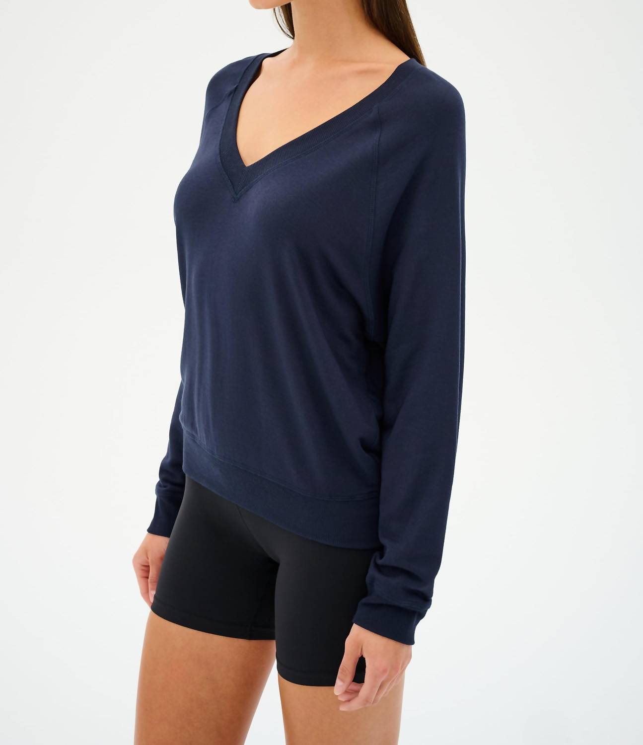 Elevate your activewear collection with the Bennie Fleece V-neck Sweatshirt by SPLITS59 in a rich indigo hue. Featuring long sleeves and crafted from a luxe blend of 95% Modal and 5% Spandex, this pullover offers both comfort and style. Made in Los Angeles, it features a pull-on closure and is enhanced with moisture-wicking and quick-dry technology. For care, machine wash and line dry are recommended.