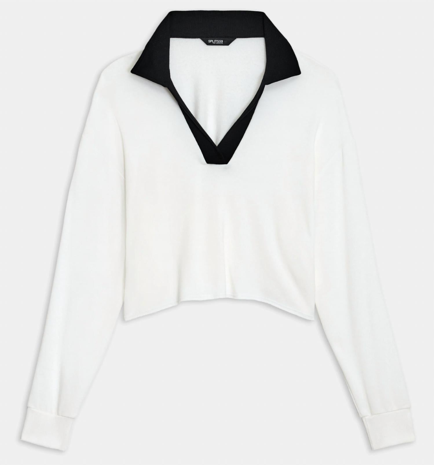 Introducing the Joan Fleece Polo Sweatshirt by SPLITS59, a chic and versatile addition to your fall wardrobe in a classic black and white colorway. This long sleeve piece features a solid pattern with a contrasting collar for a touch of elegance. Crafted from 95% Modal and 5% Spandex, this sweatshirt offers a soft, flattering drape, perfect for vacation or activewear occasions. Made in the US with a convenient pull-on closure, it is easy to care for with machine wash instructions.