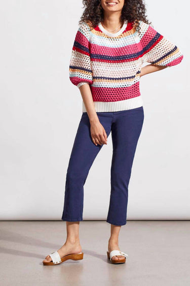 Elevate your seasonal wardrobe with the TRIBAL 3/4 Sleeve Crew Neck Sweater in vibrant Poppy Red. This women's sweater features a textured design with colorful stripes and three-quarter sleeves, complemented by a crew neckline and raglan shoulder seams. Made from 100% BCI combed cotton, it ensures comfort throughout the day. Closure: Pull on. Care: Hand wash in cold water separately, do not bleach, lay flat to dry, iron on low if needed. This piece, perfect for spring and Thanksgiving dinner parties, embraces the 90s fashion trend with its ribbed trim and open-knit style.