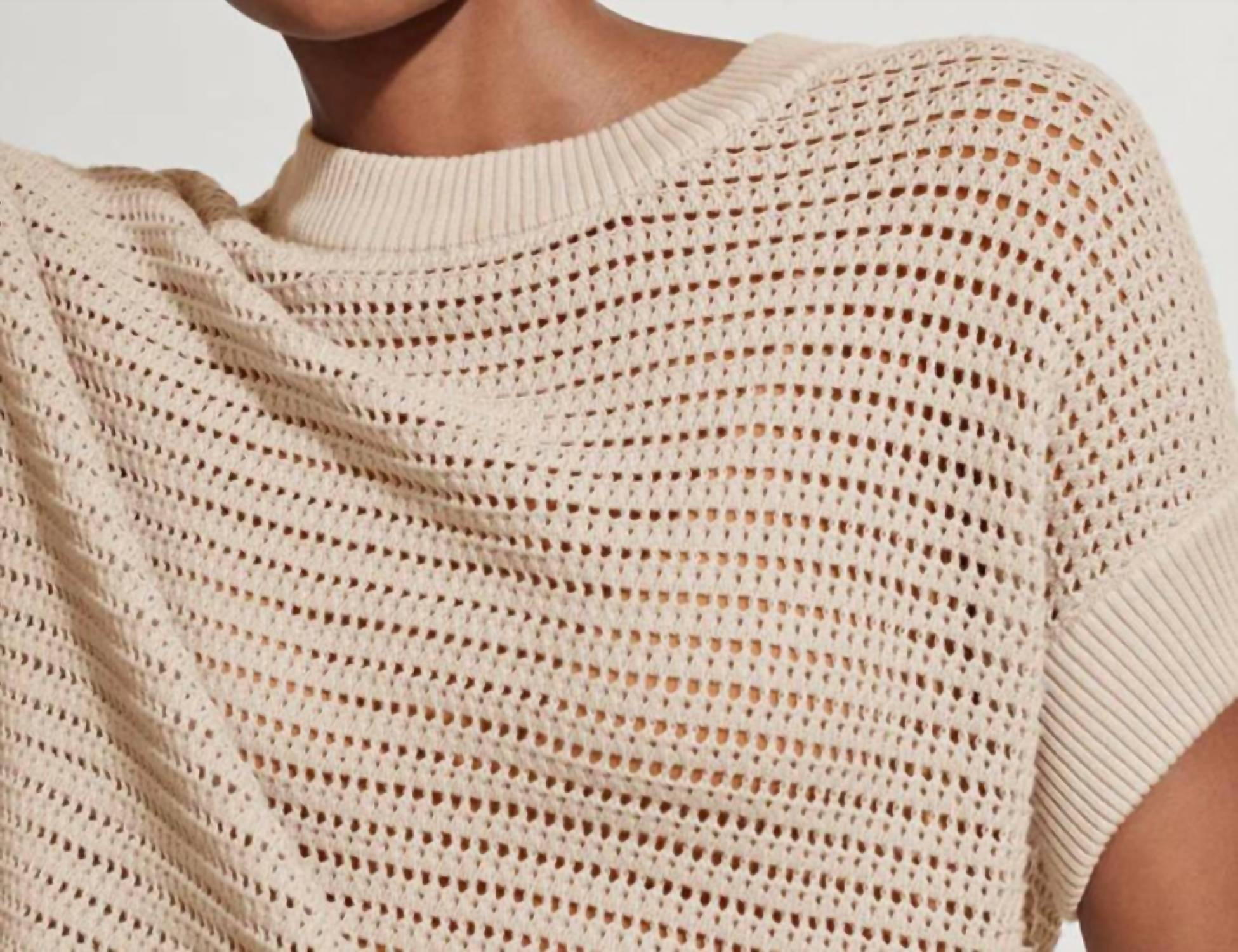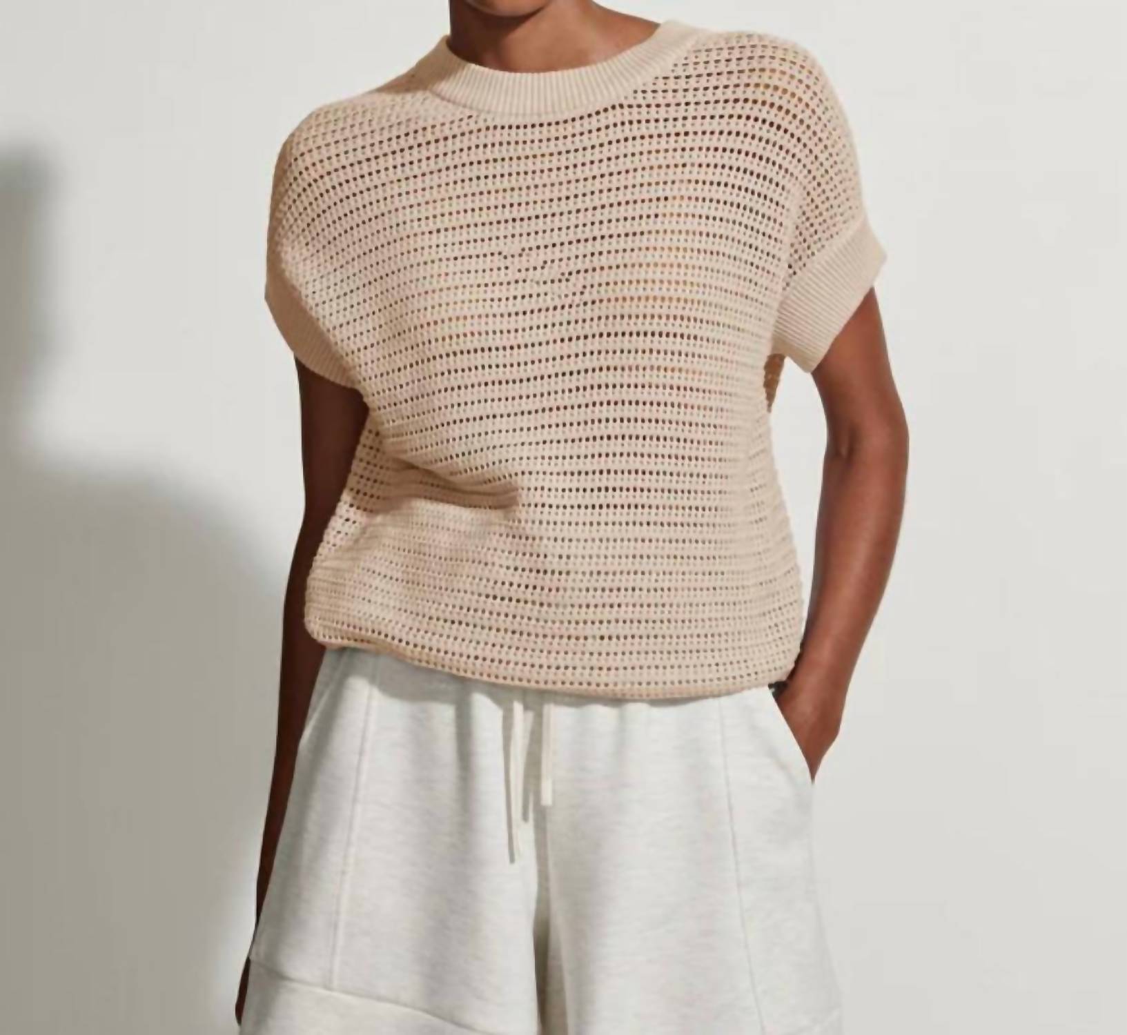 The Corvallis Knit Top by VARLEY, in a soothing Moonlight color, is an essential addition to any wardrobe. Designed with short, grown-on sleeves, this piece is crafted from textured cotton and features a classic crewneck. The pull-on style includes a versatile drawcord hem, offering a customizable fit that pairs effortlessly with shorts for a modern, cropped look. Care instructions include hand wash and lay flat to dry.