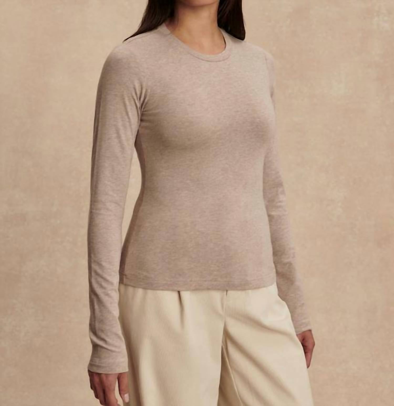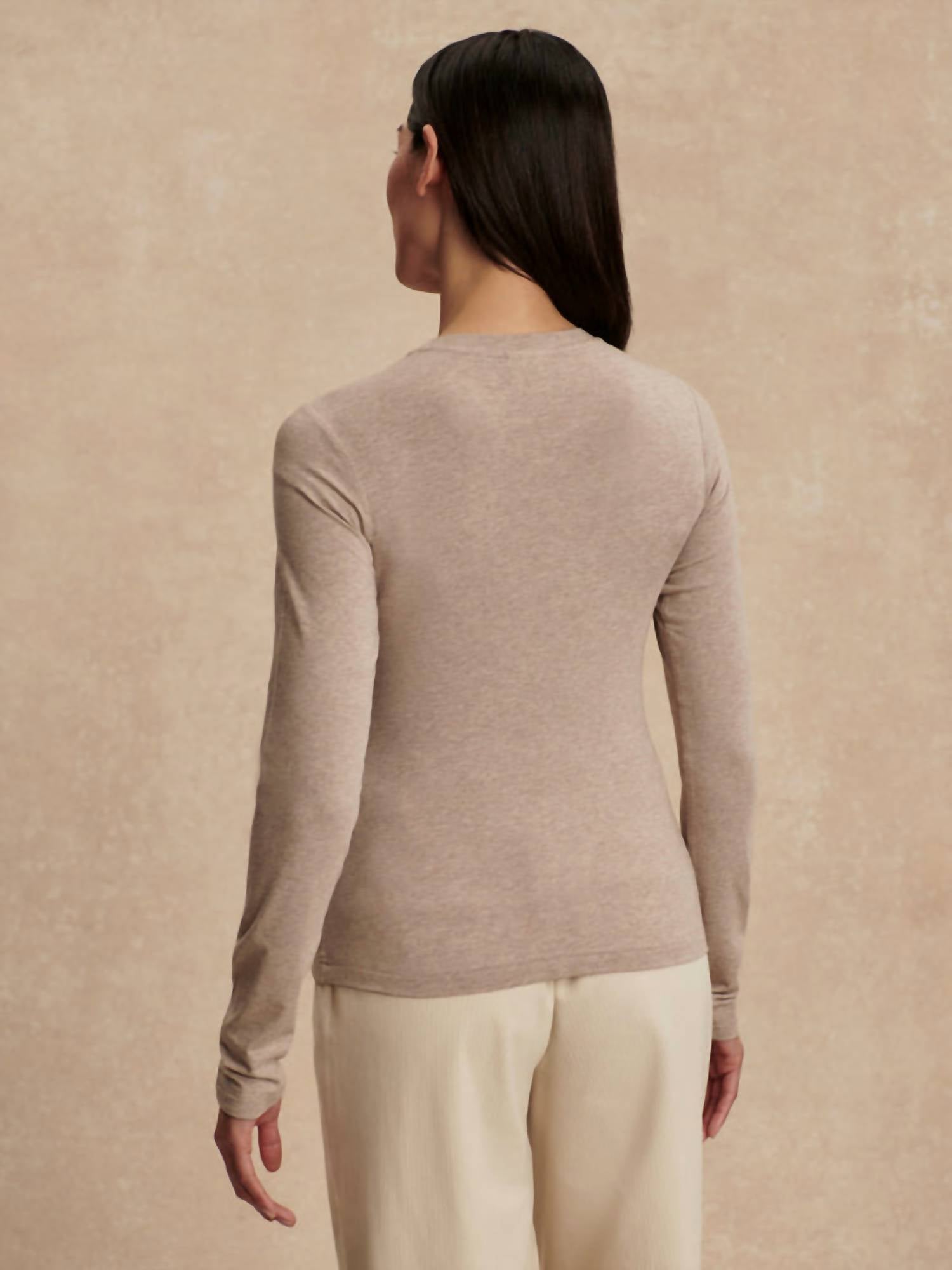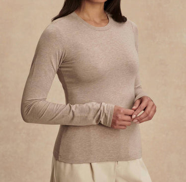 Introducing the Edna Long Sleeve Fitted Tee by VARLEY, a minimalist piece perfect for spring vacation layering. This women’s top features long sleeves and a crew neck, crafted from a soft modal jersey blend composed of 50% Modal, 45% Cotton, and 5% Elastane. Designed with a slim, slightly cropped fit, it's ideal for solo wear or as a layering staple in a chic taupe marl hue. Closure is a convenient pull-on style, with care instructions recommending a cool machine wash and to dry flat.