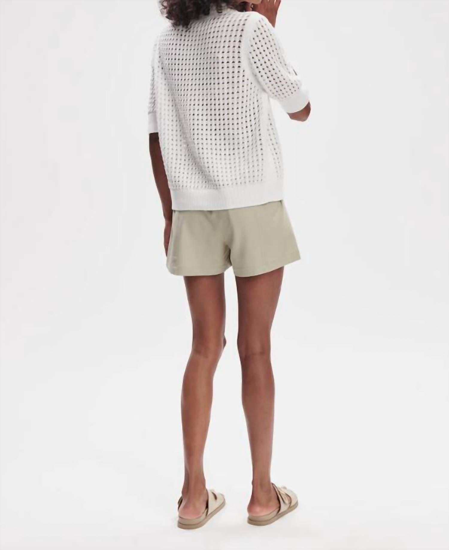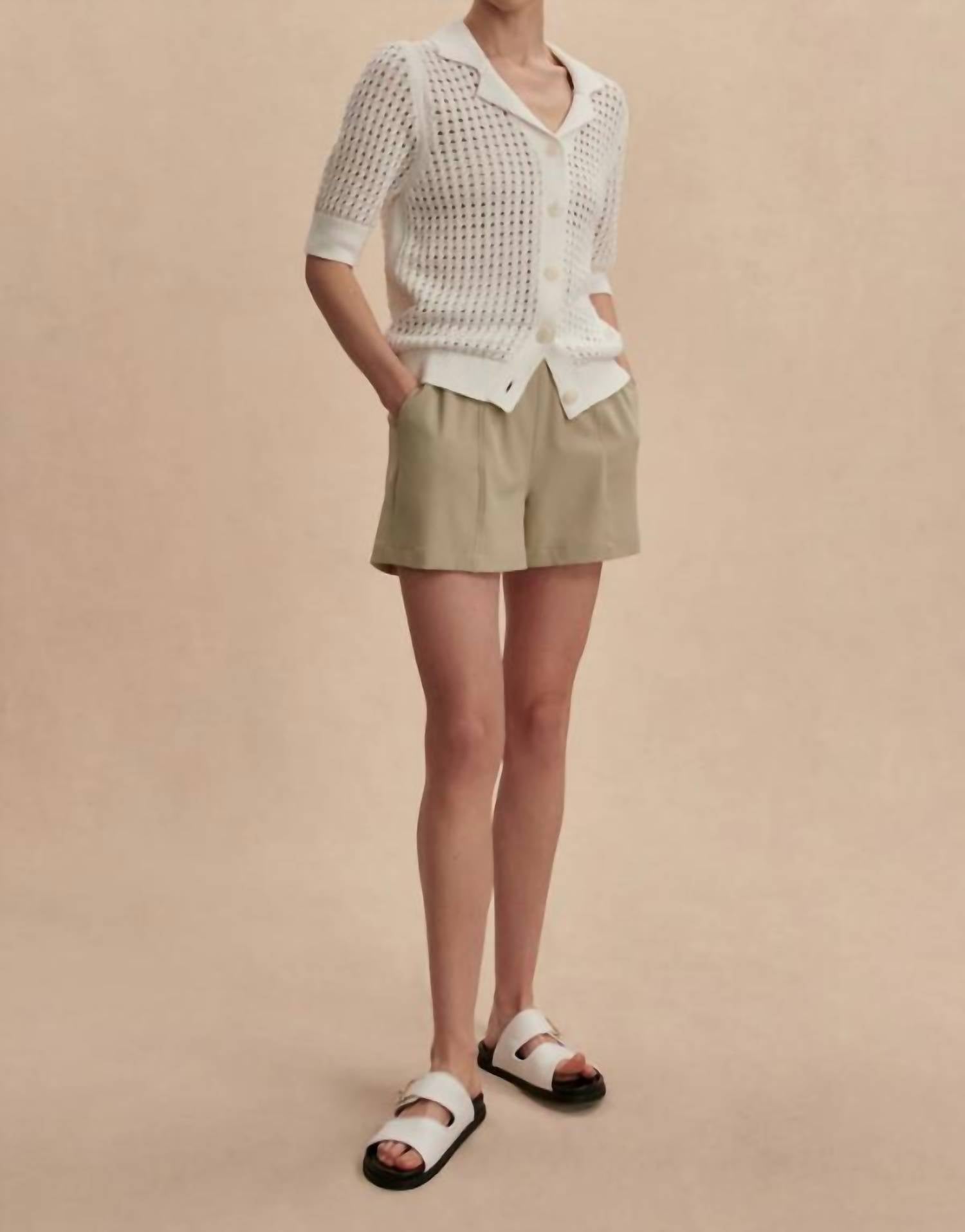 The Ellie Knit Shirt by VARLEY is an essential button-down crafted from 100% cotton, offering a fine twist cable stitch for a textured, sophisticated look. Featuring short sleeves and a revere collar, this shirt is perfect for keeping you stylishly elegant and comfortable. Closure is by button, ensuring a classic and clean finish. For care, machine wash cool, lay flat to dry, and iron on low temperature, avoiding bleach and tumble drying.