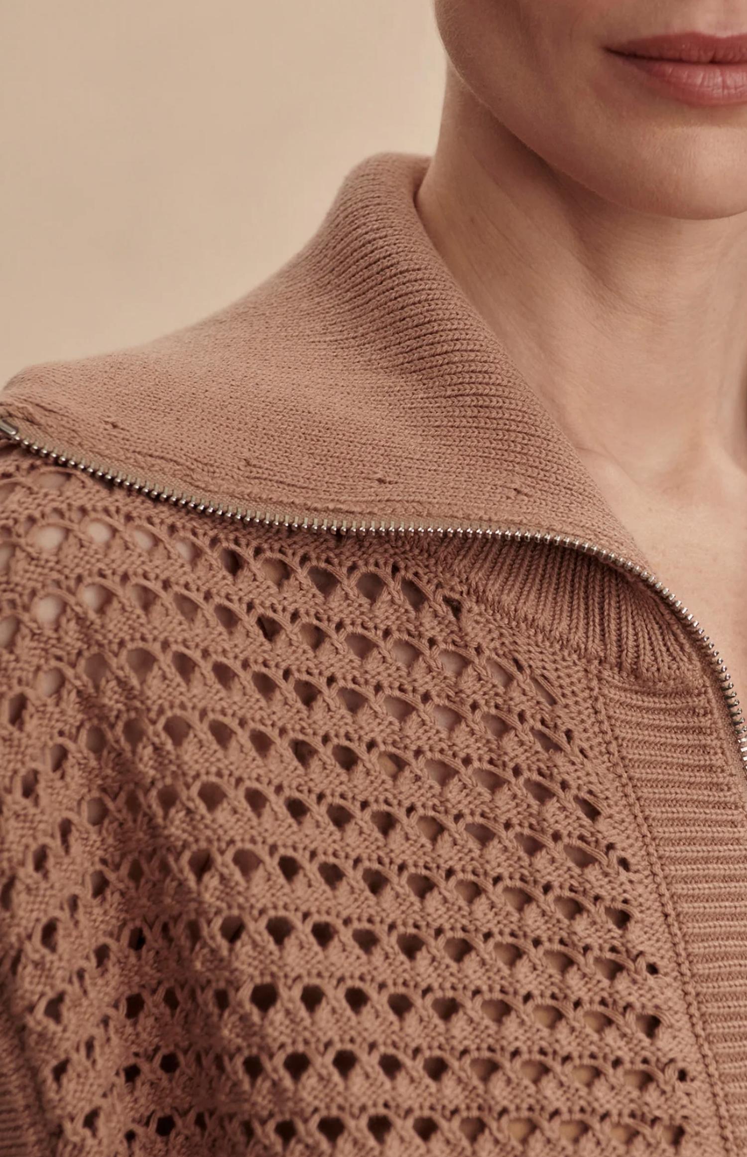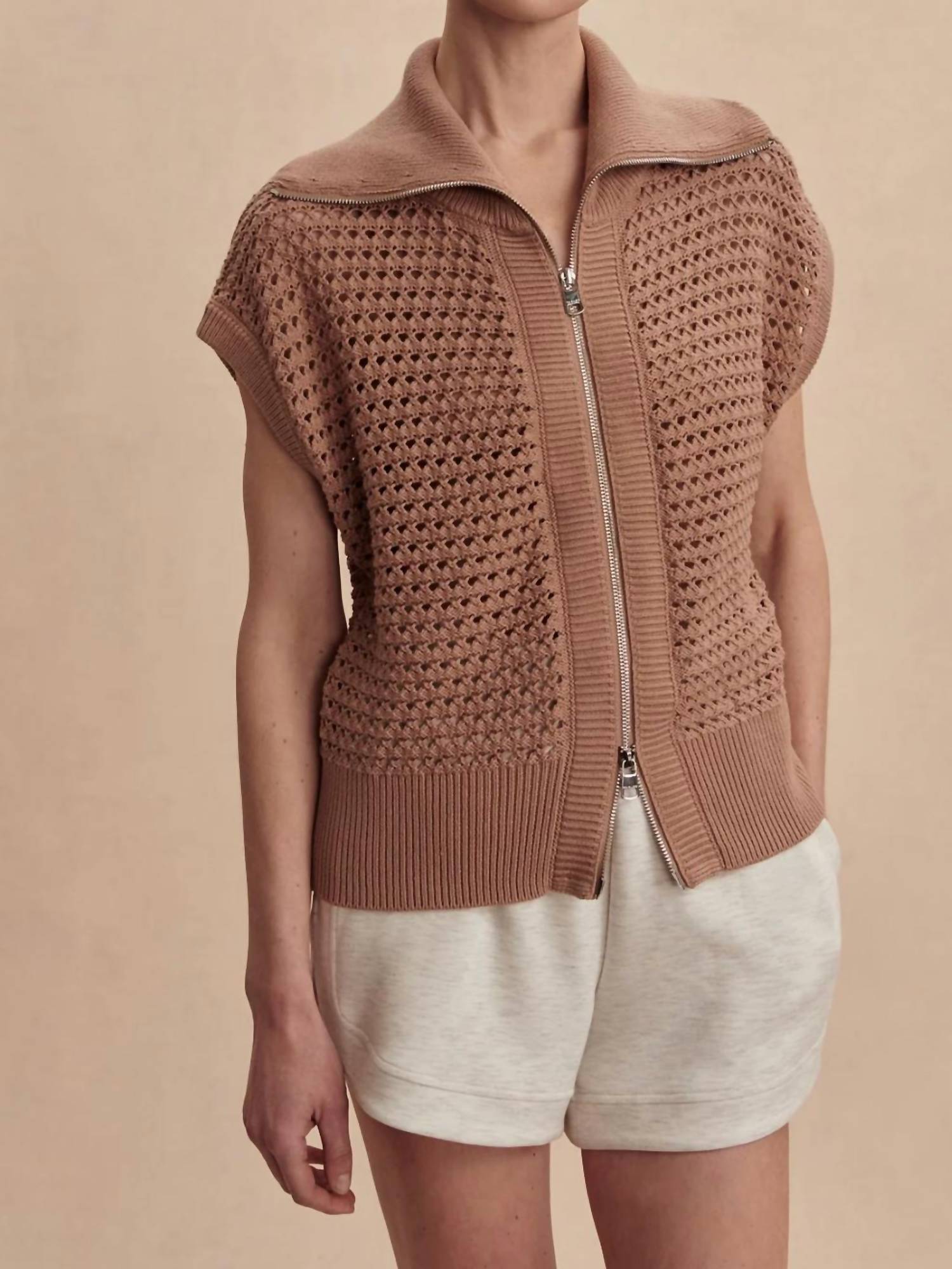 Introducing the Liliana Knit Gilet by Varley, crafted from 100% cotton in a beautiful chanterelle hue. This textured piece features a unique pointelle knit design alongside slight cap sleeves, perfect for minimalist summer layering. It includes an oversized collar for added style and is completed with a convenient zip closure. Care instructions recommend machine washing for easy maintenance. Model is 5'9.5" and is wearing size S with a front length of 21.5".