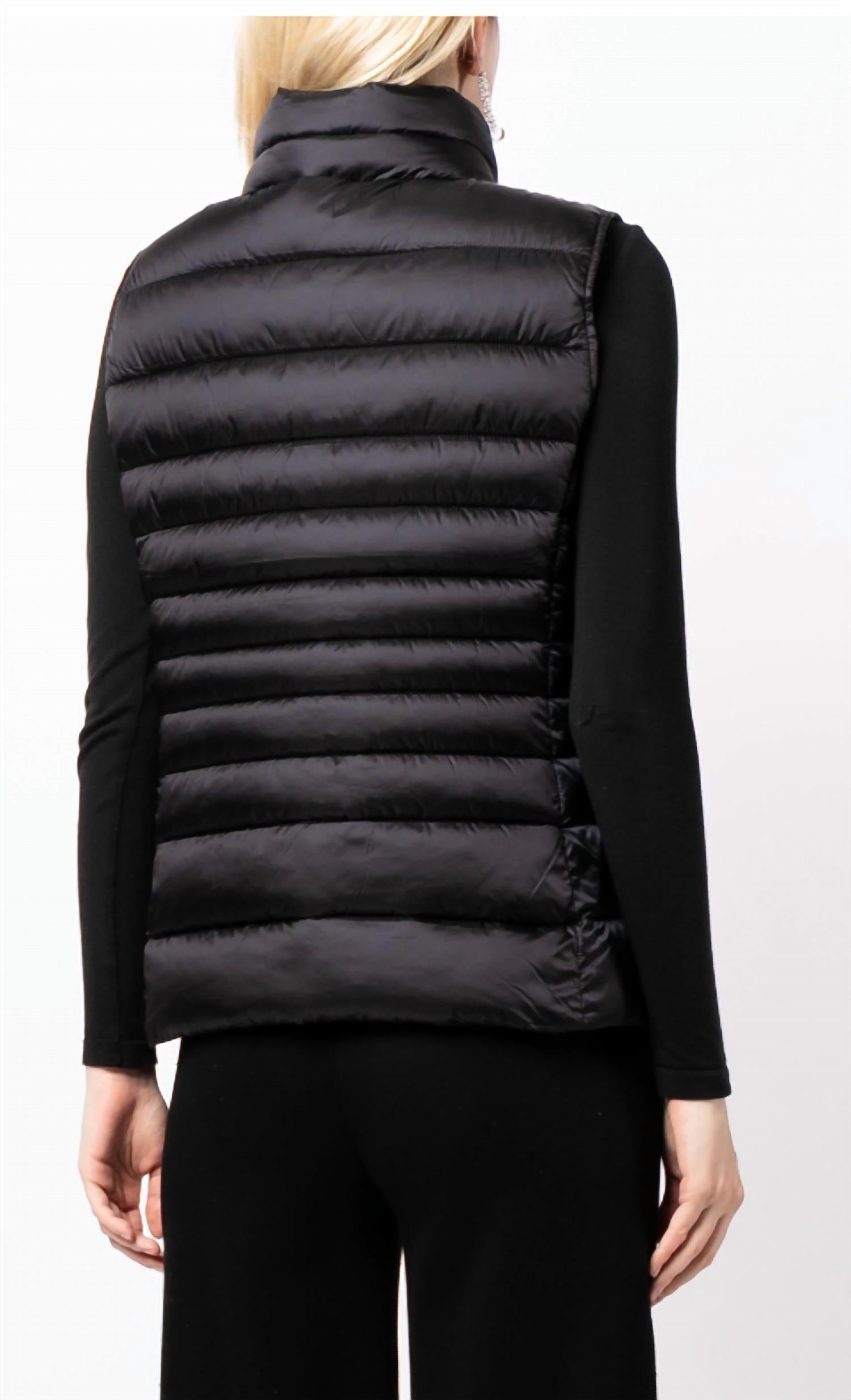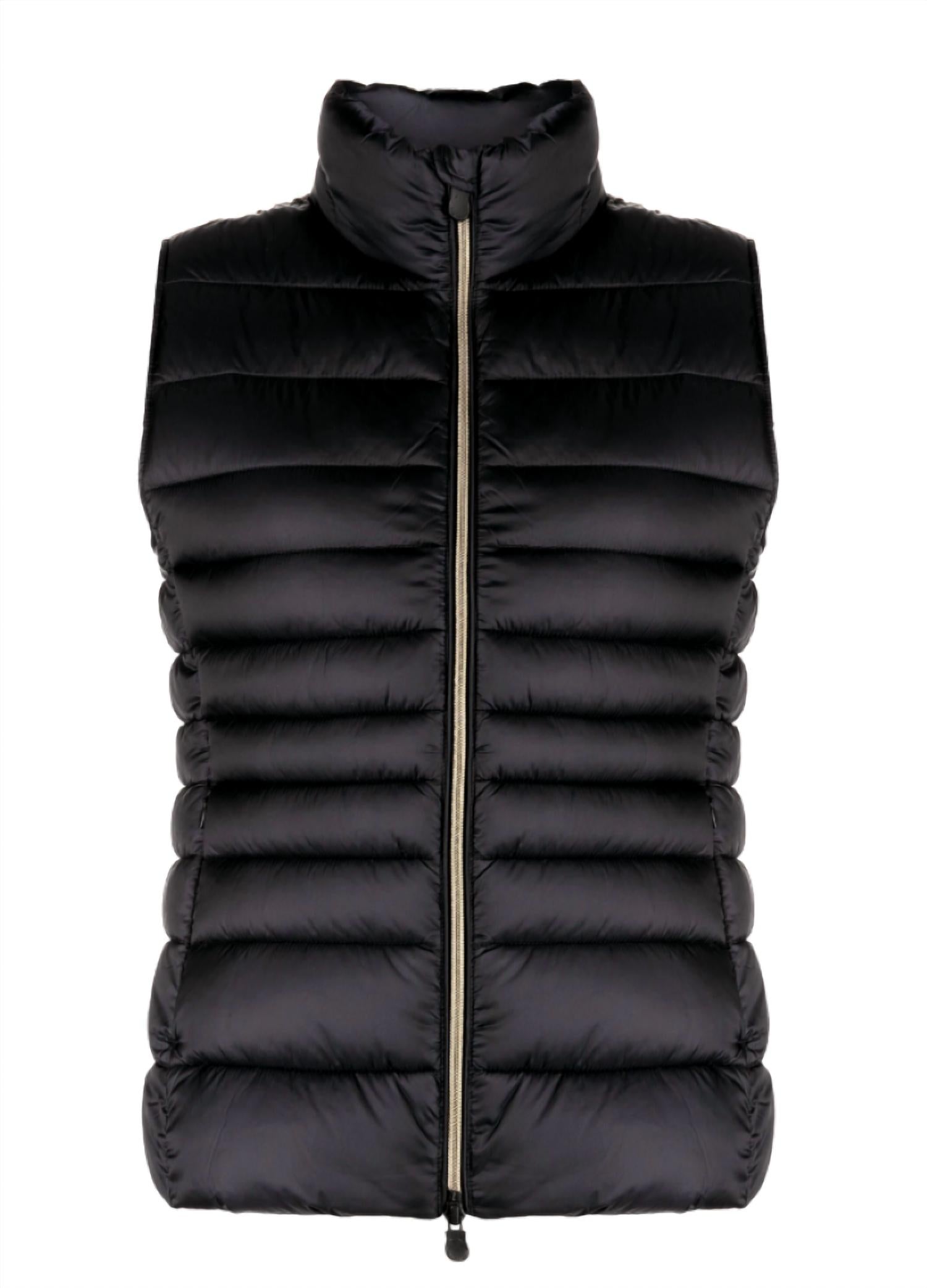 The SAVE THE DUCK Lynn Quilted Puffer Vest is a chic, sleeveless addition to your wardrobe in a classic solid black. Crafted from durable nylon, this vest features a turtleneck with high collar for added warmth and style. Made in the USA with an imported touch, it includes practical pockets and gold hardware accents throughout. Closure: Front zip closure. Care: Dry clean only.