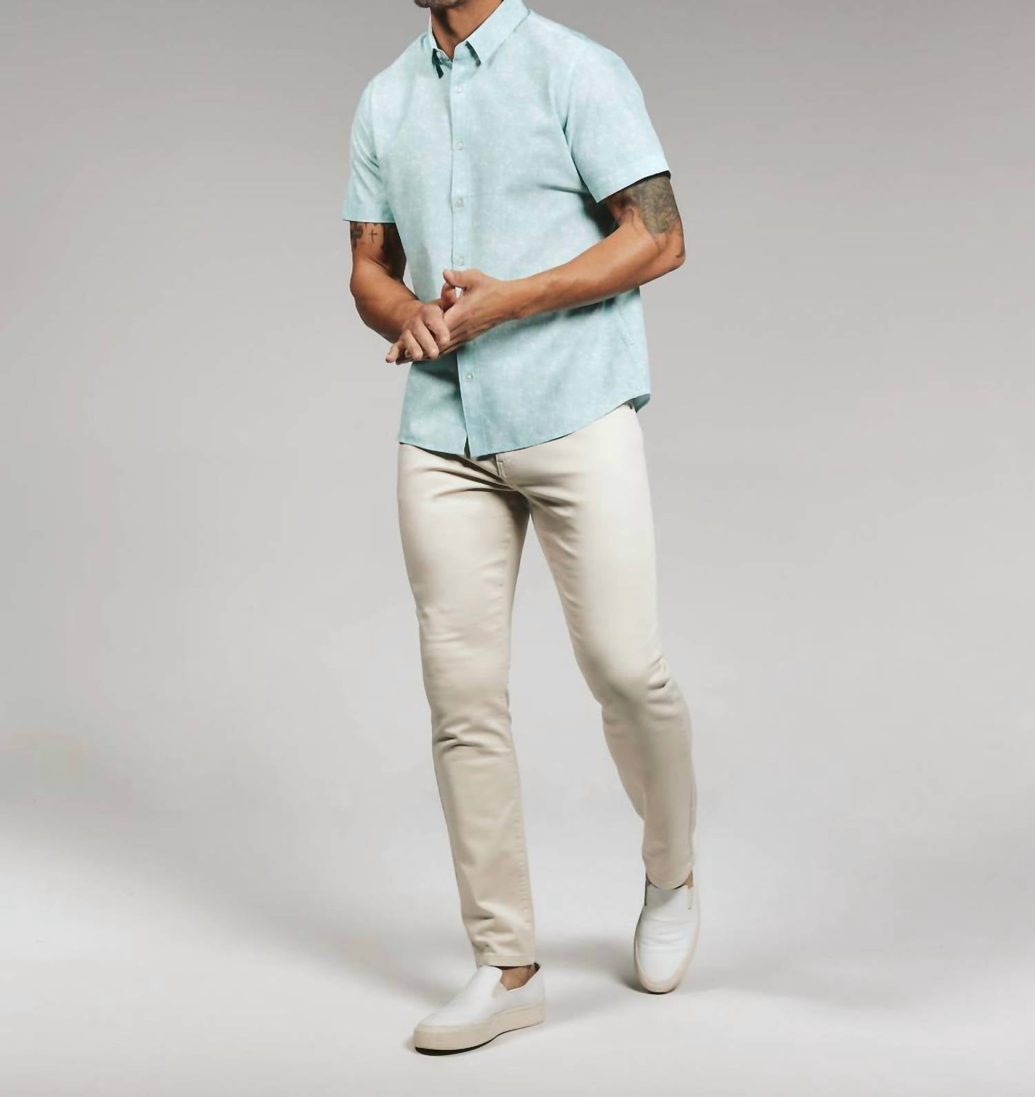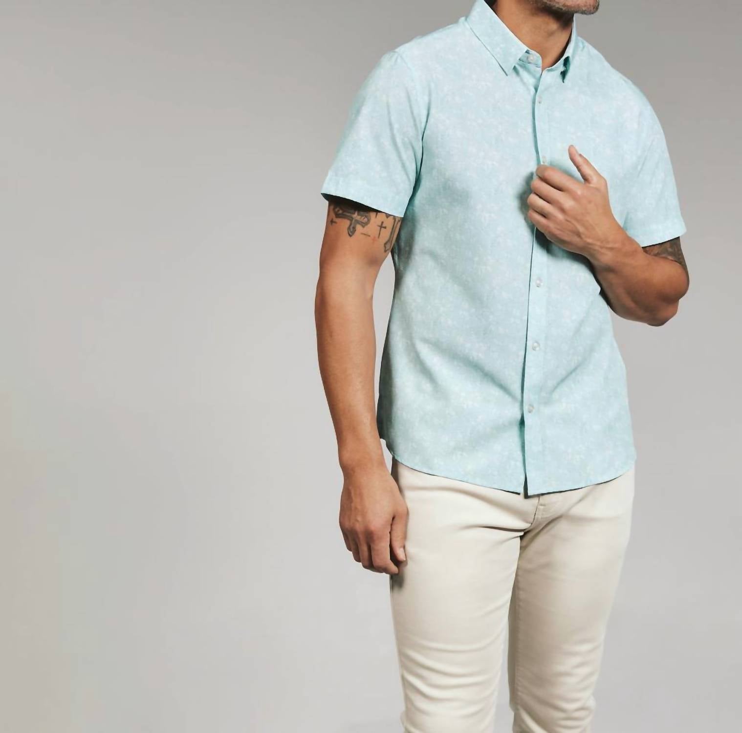 Introducing the 7Diamonds Hollis Short Sleeve Shirt in a refreshing seafoam hue, perfect for warm-weather occasions. Crafted from a lightweight blend of 90% polyester and 10% spandex, this men's shirt offers breathability and easy movement, making it ideal for casual getaways and sunny weekends. The minimalist design features a textured pattern with a collar neckline and is finished with a button closure. Care is straightforward: machine wash cold on a delicate cycle, low tumble dry, and do not iron.