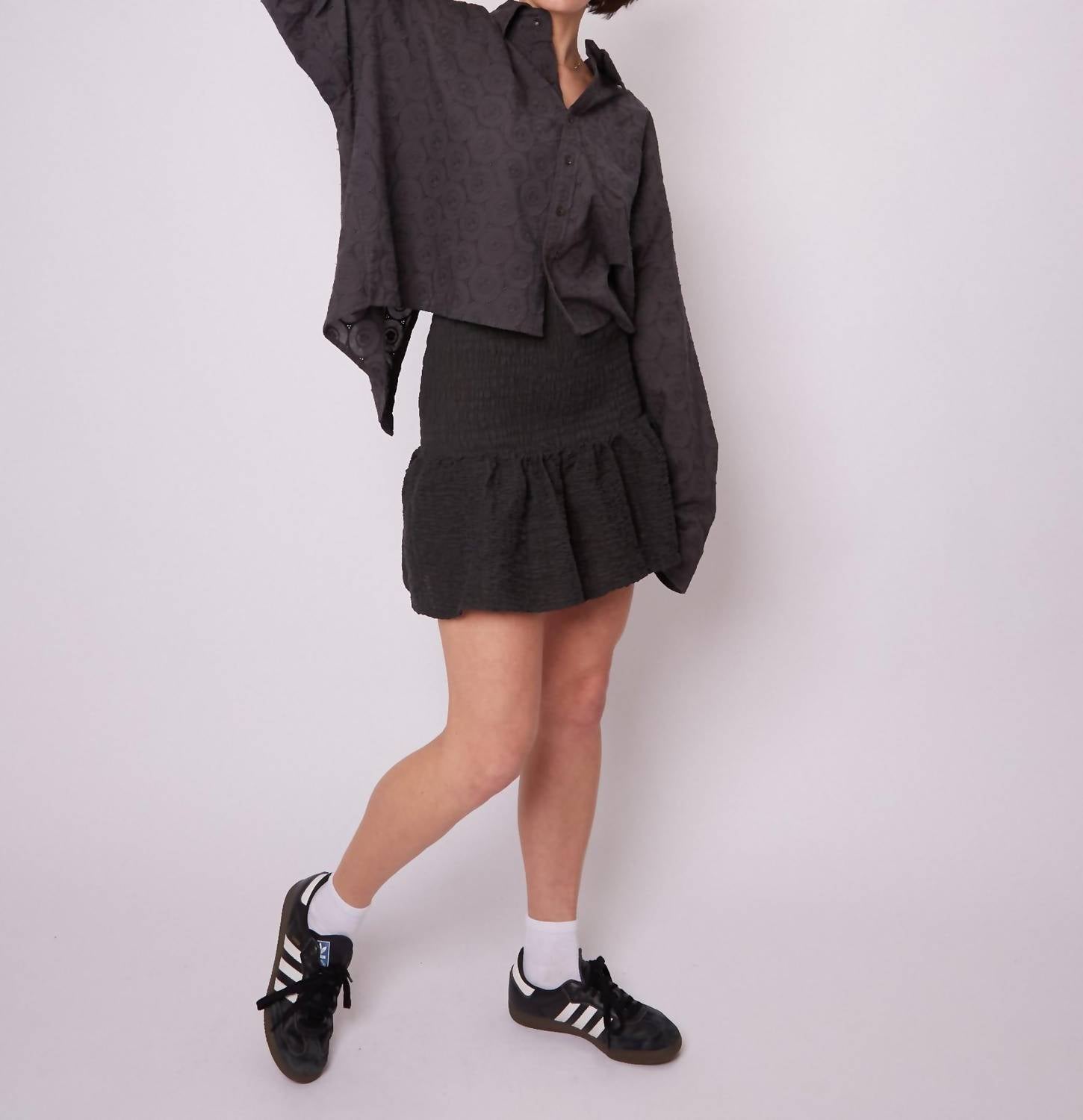 Introducing the ACACIA Tove Mini Skirt in sophisticated Licorice, a must-have for your minimalist wardrobe. This solid-color mini skirt is crafted from 100% Organic Cotton (GOTS Certified) and features smocked detailing with an elasticized waist for a perfect fit. Closure: Pull on. Care: Machine wash and tumble dry. Ideal for a spring dinner party or Thanksgiving gathering, this timeless piece perfectly captures effortless elegance.