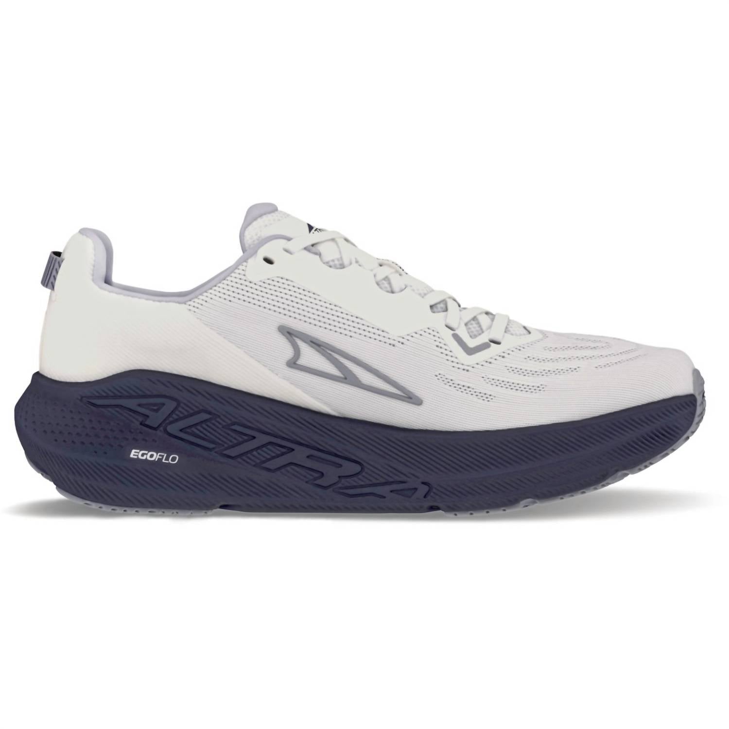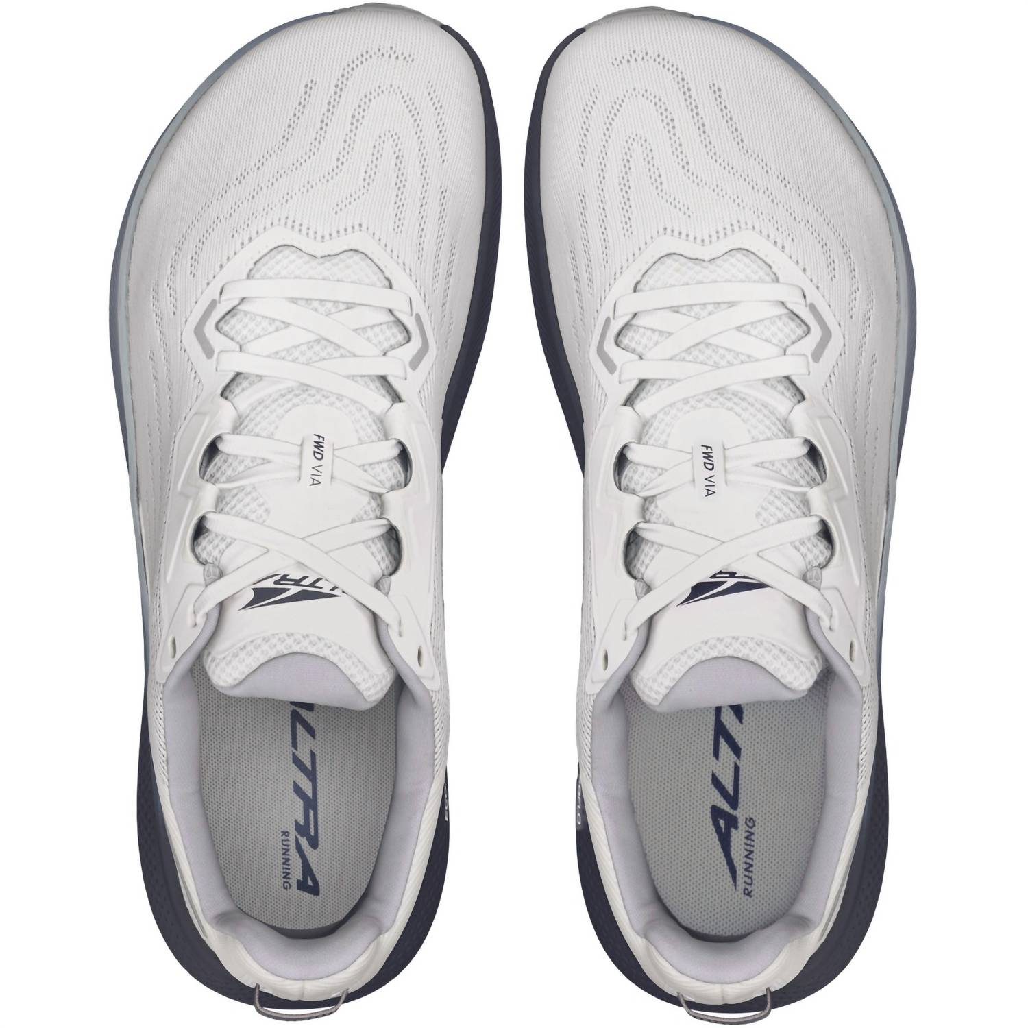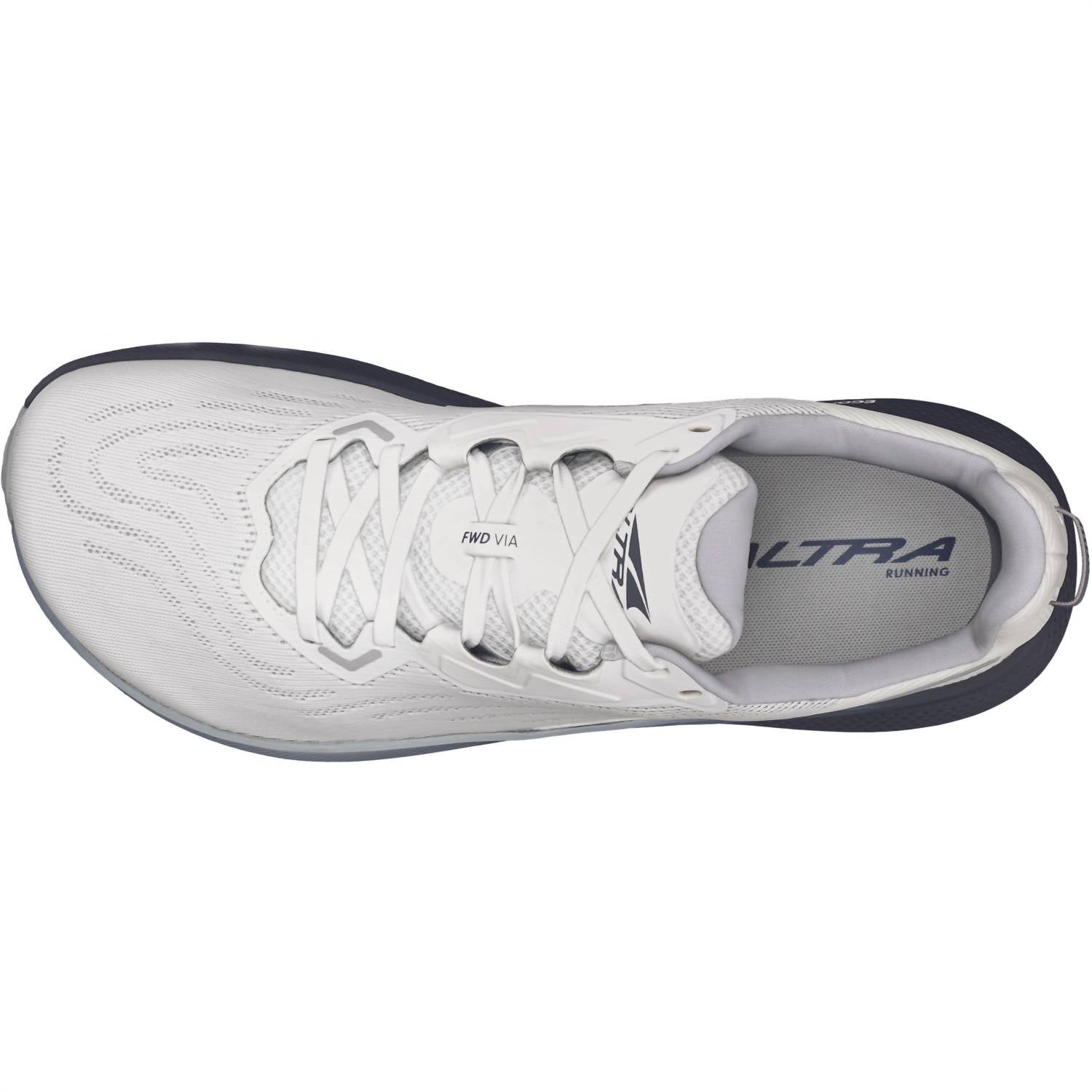 Elevate your running experience with the Men's FWD VIA Running Shoes from Altra, designed in a stylish White/Navy color. These athletic shoes feature a round toe shape and a mid (2 1/4"-3") wedge heel for enhanced comfort during fitness or workout sessions. The engineered spacer mesh upper provides breathability, while the innovative Altra EGO™ FLO midsole offers a lightweight, cushioned ride. With a low 4mm drop and Altra's Original FootShape™ Fit, these shoes ensure a smooth transition and roomier toe box for a comfortable fit.