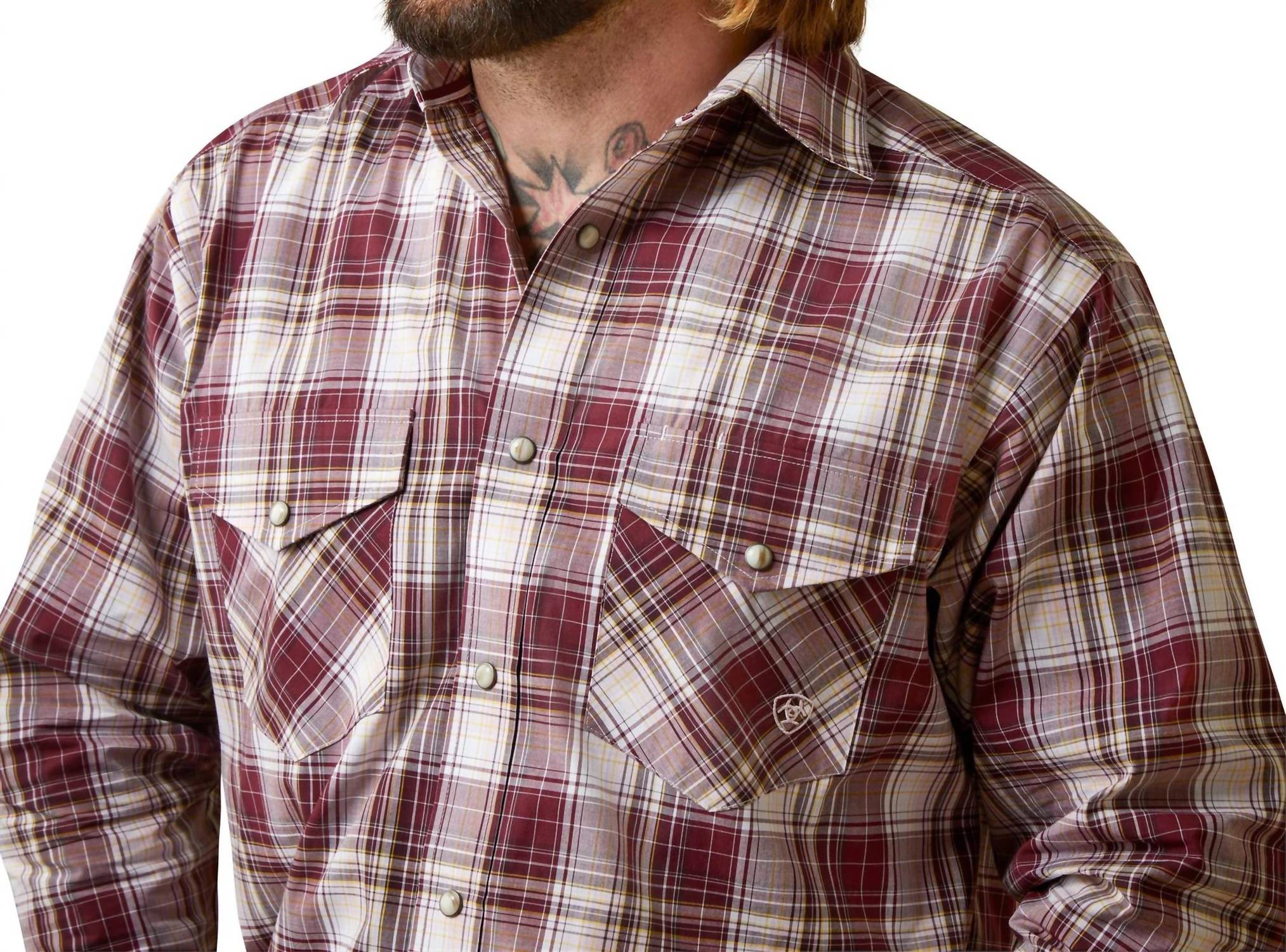 Stay stylish with the Ariat Adrian Plaid Button-down Western Shirt, a classic choice for any casual setting. This men's shirt features a button-down placket and cuffs, with long sleeves and a maroon and white plaid print that exudes timeless appeal. Designed with a single patch pocket on the left chest adorned with logo embroidery, it combines fashion and function. Crafted from an 82% Cotton and 18% Polyester blend, it offers comfort and durability. Closure: Button closure. Care: Machine wash cold, tumble dry low.