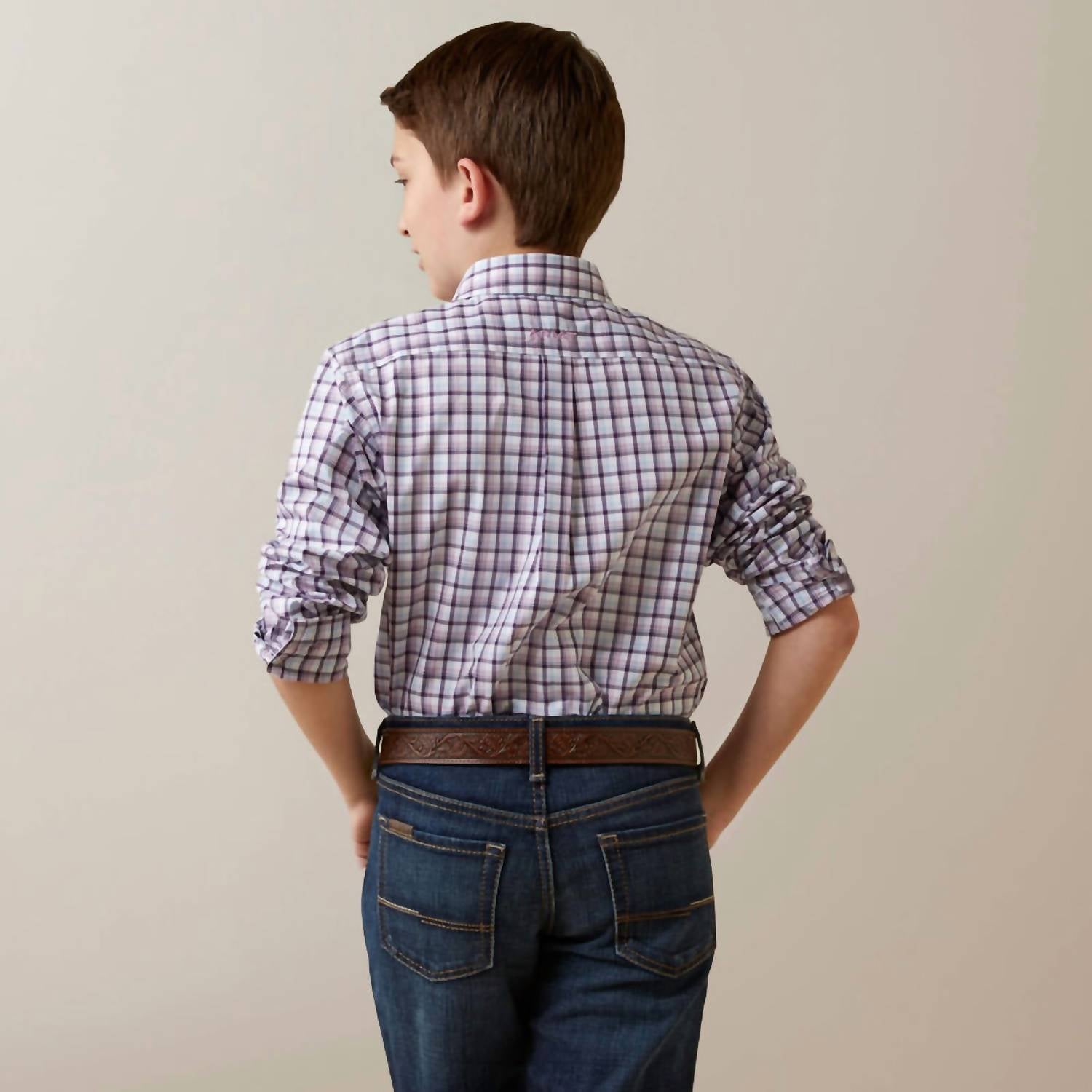 Stylish choice for the young gentleman. Crafted from 100% cotton, ensuring comfort and durability. Designed in an eye-catching white and purple plaid pattern. Features a collared neck to keep the look smart and polished. Offers greater arm mobility for ease of movement. Effortlessly maintained with machine washing.
