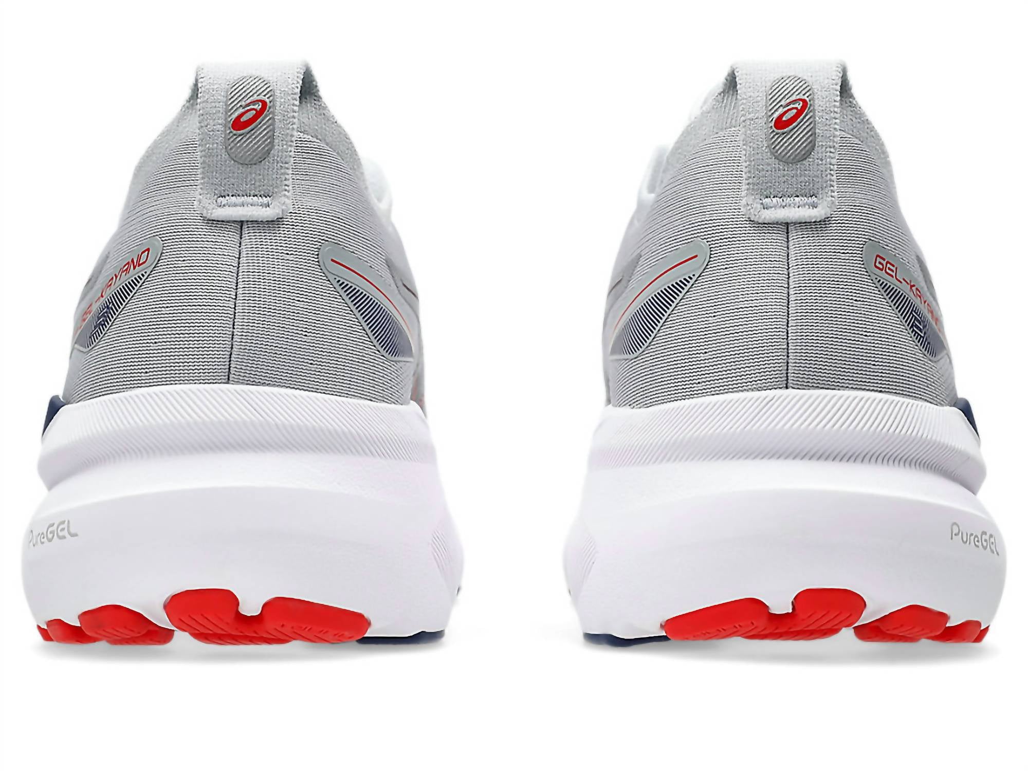Introducing the ASICS Gel-Kayano 31 Running Shoes in Piedmont Grey/Fiery Red, engineered for both neutral and stability support. These athletic shoes are highlighted by a 10 mm heel drop and weigh an optimized 305 g (10.8 oz), perfect for runners seeking to enhance their distance. The shoes feature ASICS' 4D Guidance System, promoting adaptive stability and cushioning through innovative FF Blast Plus Eco foam and PureGE technology. Designed for men's feet with a round toe shape, these are ideal for summer athleisure and game day activities. (Style #: 1011B995-021)