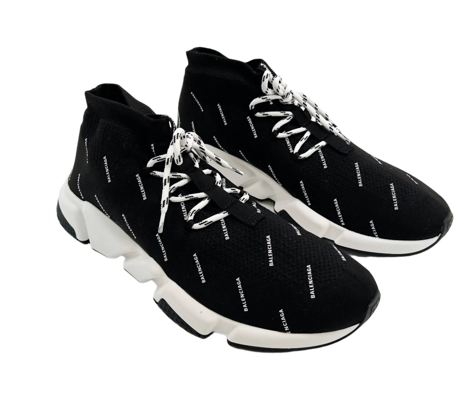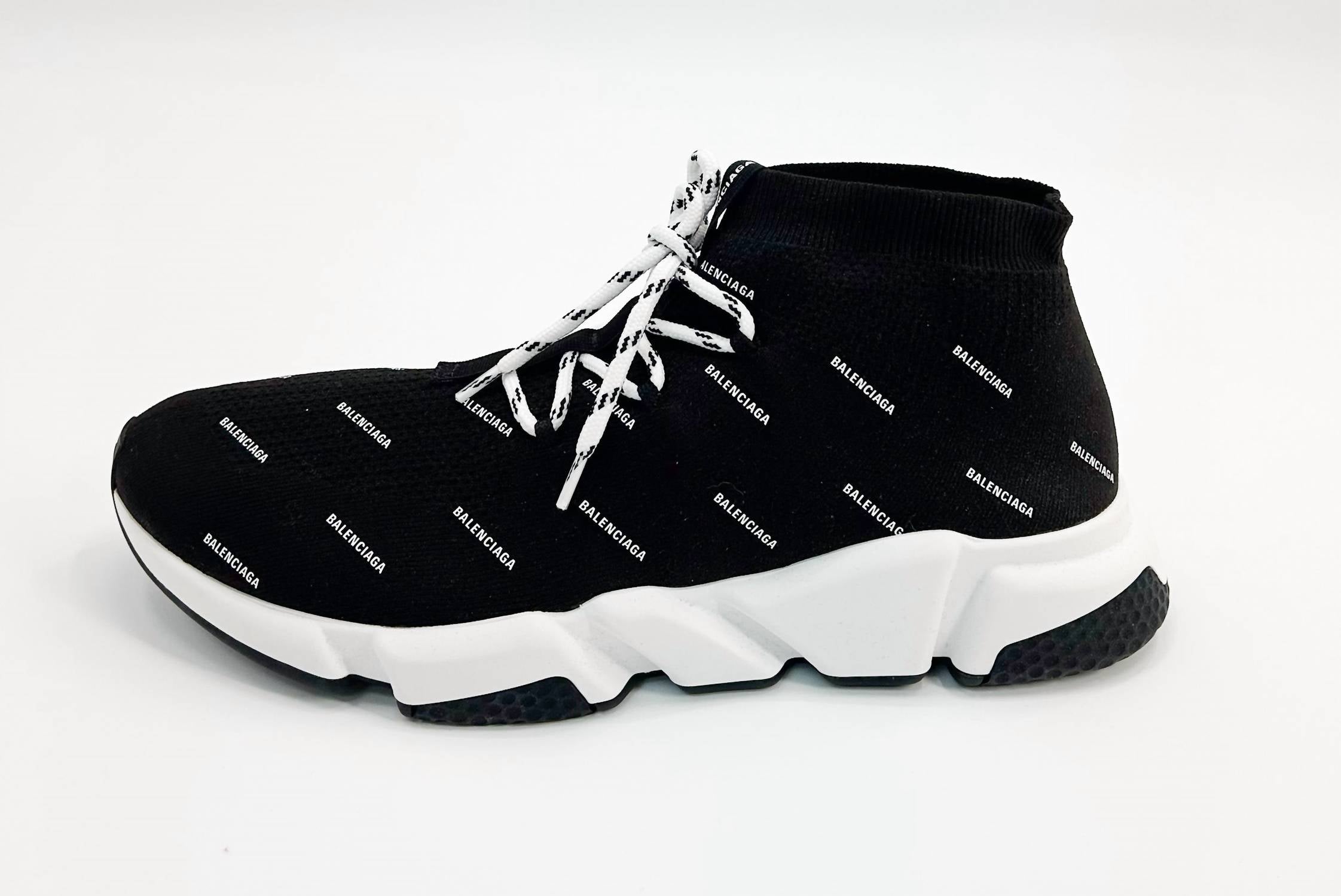 Elevate your streetwear game with the Balenciaga Speed Lace-Up 'All Over Print - Black' sneakers. These men's trainers feature a striking all-over logo print and a 3D-knit construction for a modern touch. Made in Italy, they come with a front lace-up fastening and a chunky rubber sole for unrivaled comfort and style. Perfect for the summer season and holiday parties, these sneakers are crafted with 100% fabric and rubber components, showcasing Balenciaga's commitment to high fashion and luxury.