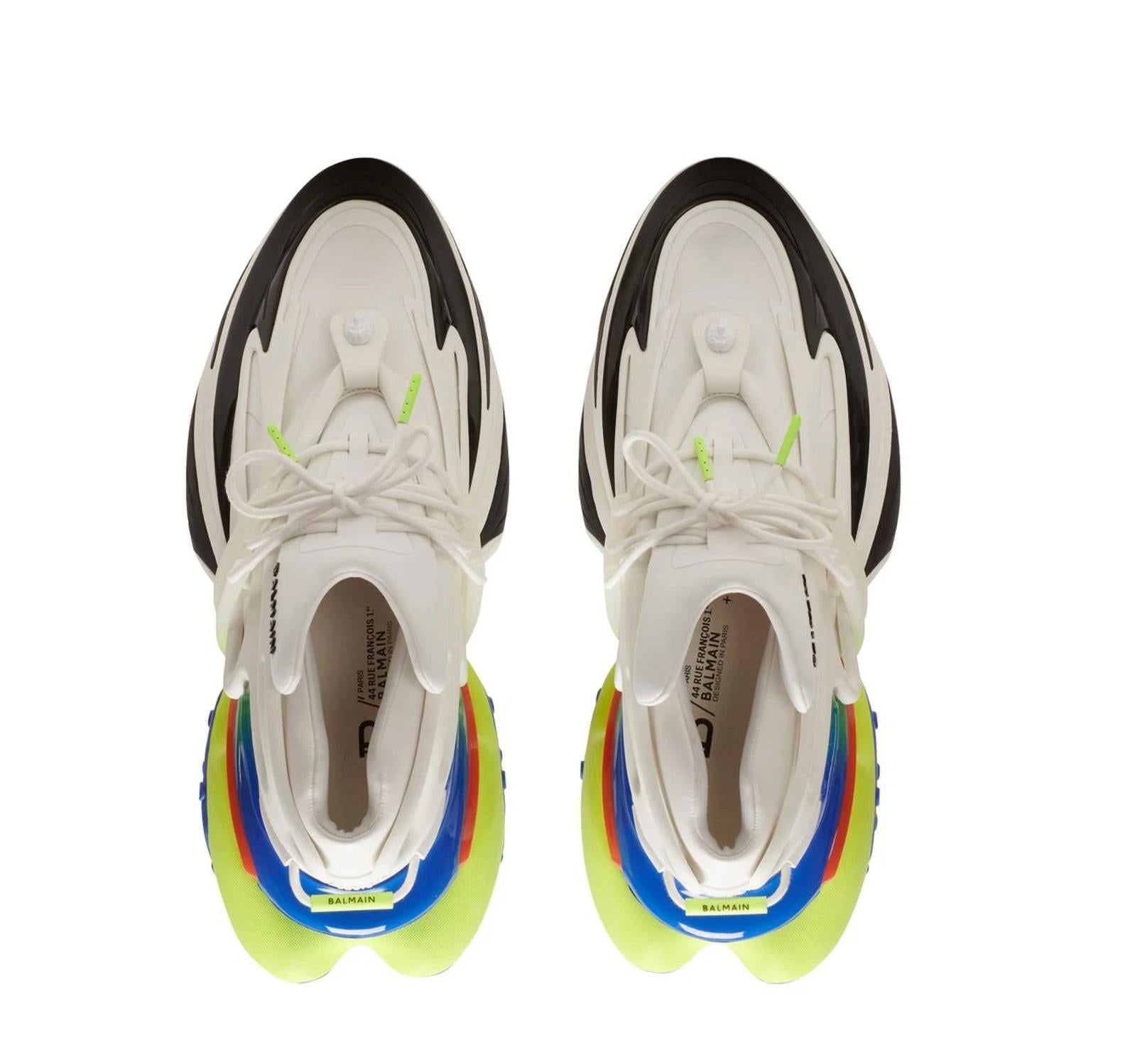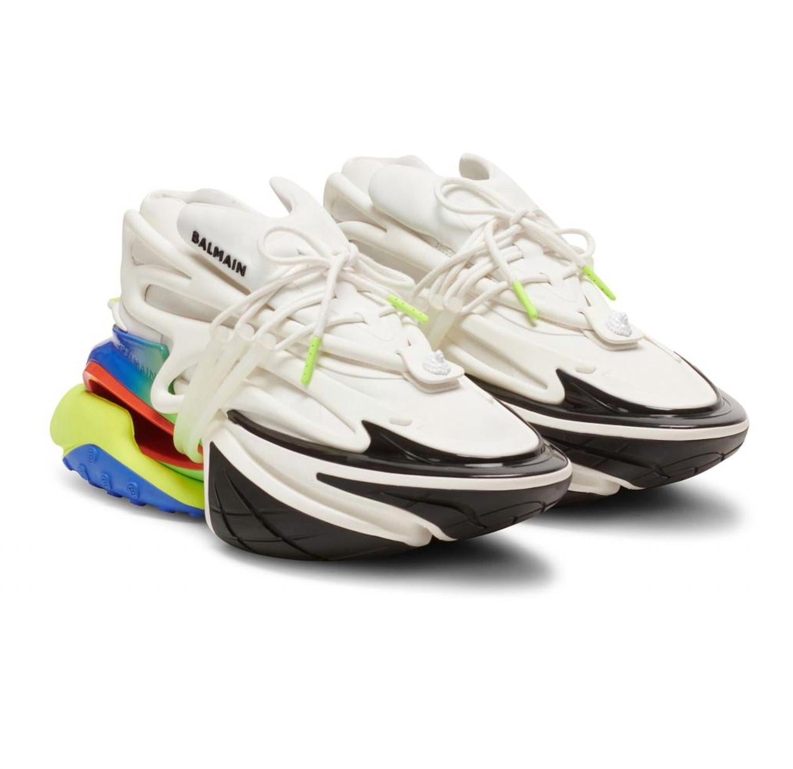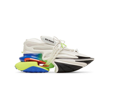 Introducing the Men's Unicorn Low-top Neoprene and Leather Chunky Sneakers by Balmain, a standout in both design and comfort. These sneakers feature a low-top silhouette with sculptural rubberized overlays in a striking white and multicolor finish. The lace-up closure is complemented by a graphic press-stud tab at the vamp, and logo hardware on the padded tongue and side. The padded collar, pull-loop at the heel counter, and treaded rubber outsole ensure a snug fit and durability, while the jersey lining adds a touch of luxury.