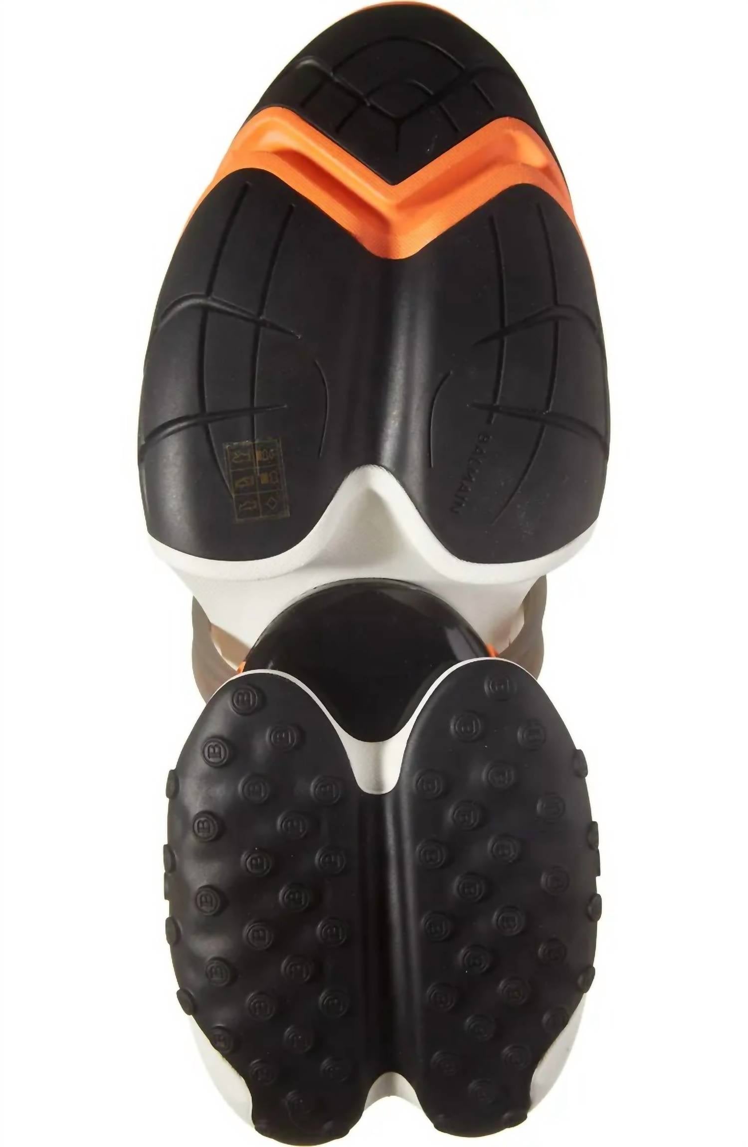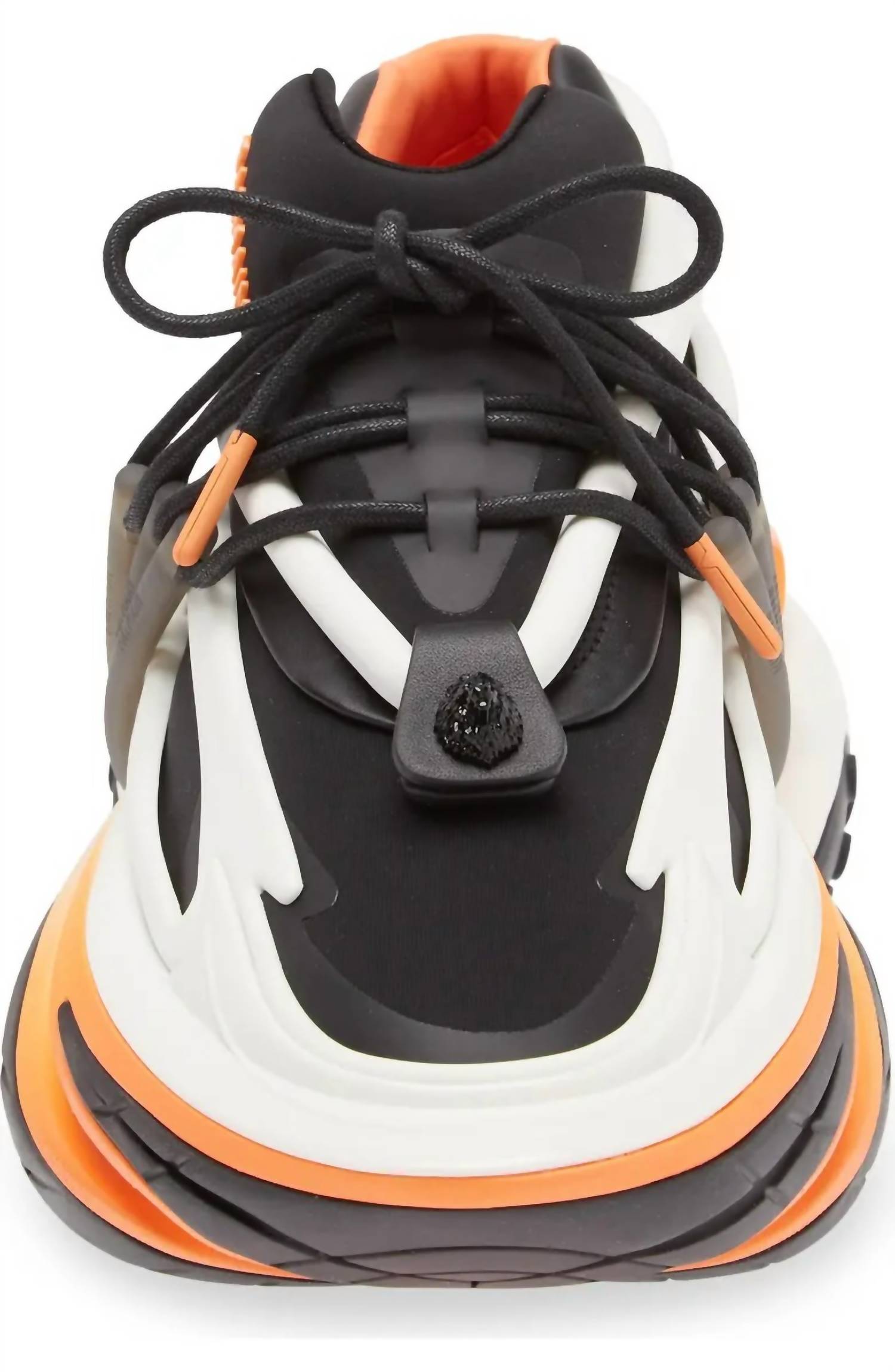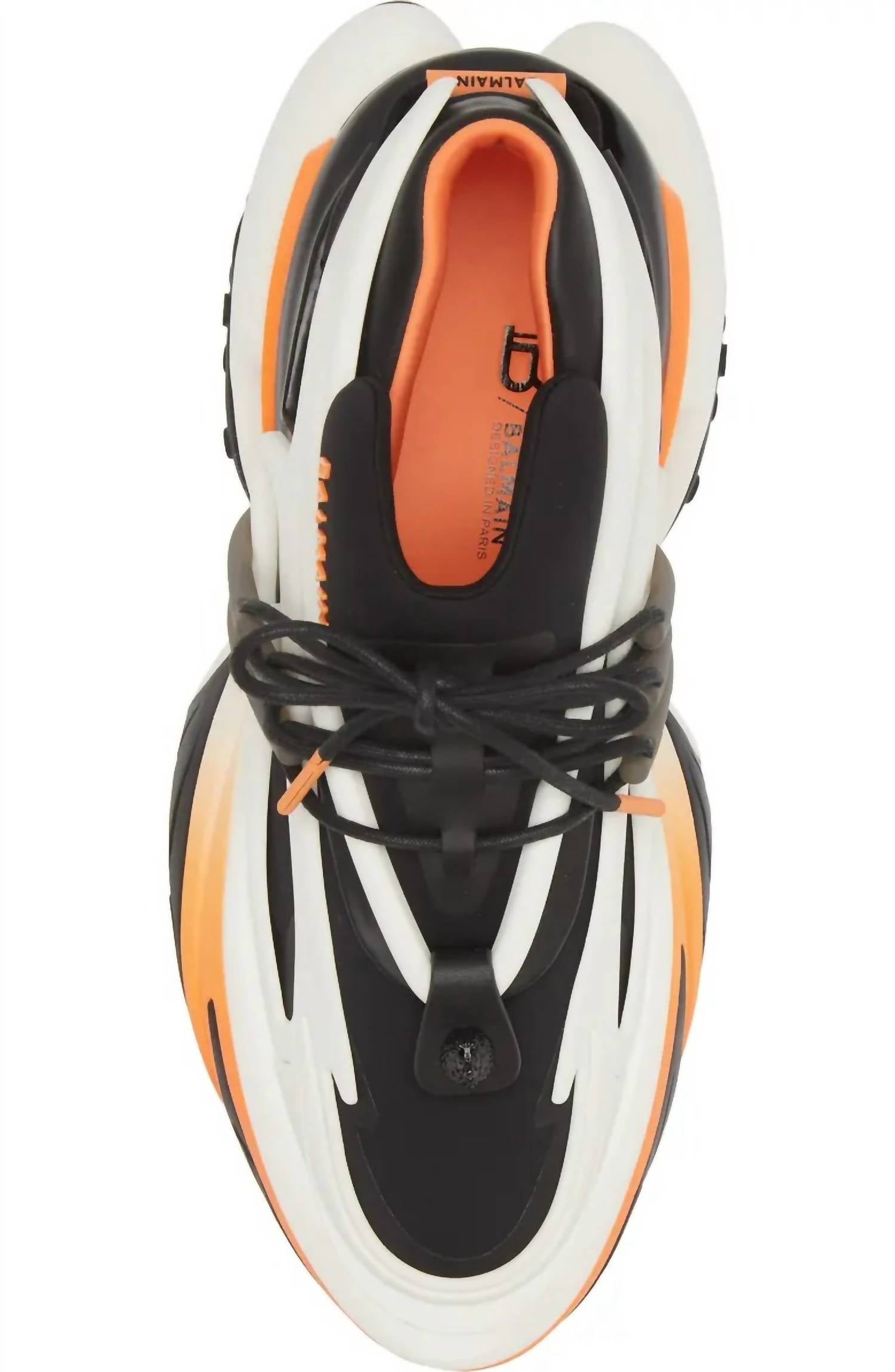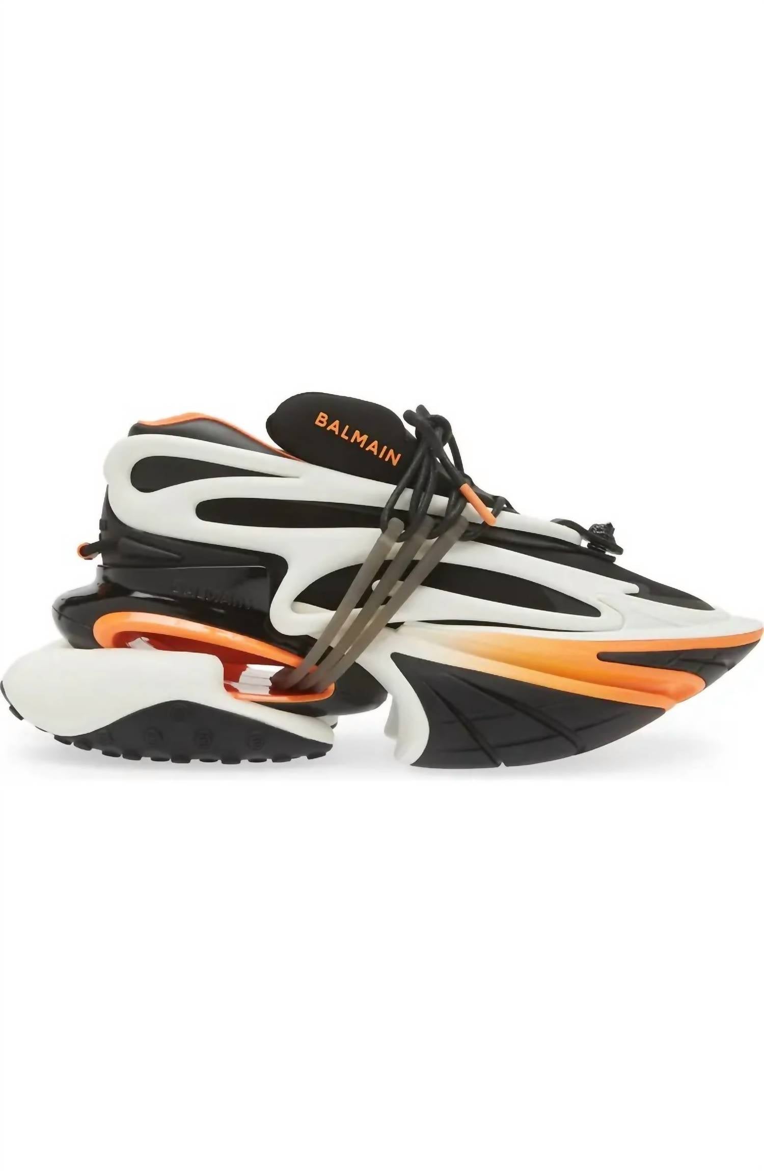 Introducing the Men's Unicorn Low-top Neoprene and Leather Chunky Sneakers by BALMAIN, a bold blend of style and function. Crafted in black and orange, these sneakers feature neoprene and buffed calfskin with TPU trim, and a lace-up closure for secure wear. The sculptural rubber platform midsole and treaded rubber sole provide stability, while the vamp's graphic press-stud tab and logo hardware add a modern touch. Designed with a padded collar, jersey lining, and pull-loop at the heel counter, these sneakers offer both comfort and striking design, boasting a 2.5-inch chunky heel.