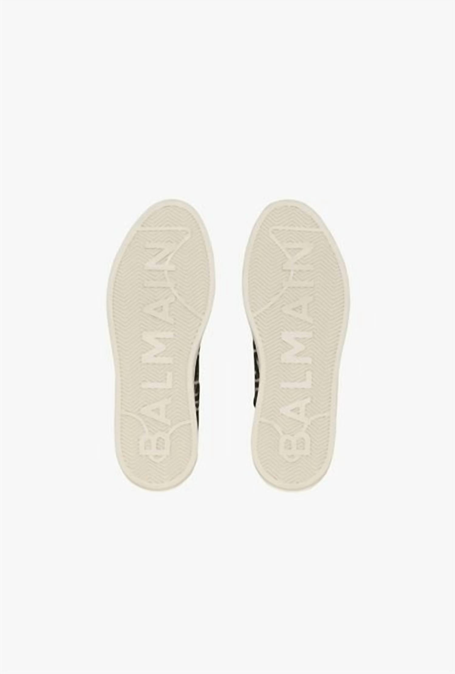 Step up your sneaker game with the Women's B-court Bicolor Monogram Jacquard High-top Sneakers from BALMAIN, a perfect blend of style and luxury. Crafted in Italy, these sneakers feature black laces and a stylish tongue with a leather panel adorned with the Balmain logo. The design is completed by an ivory TPU sole showcasing a tone-on-tone Balmain logo, providing both flair and comfort. Main material: 84% Cotton, 16% Polyester. Fits true to size and finished in a chic Black/Ivory color scheme.