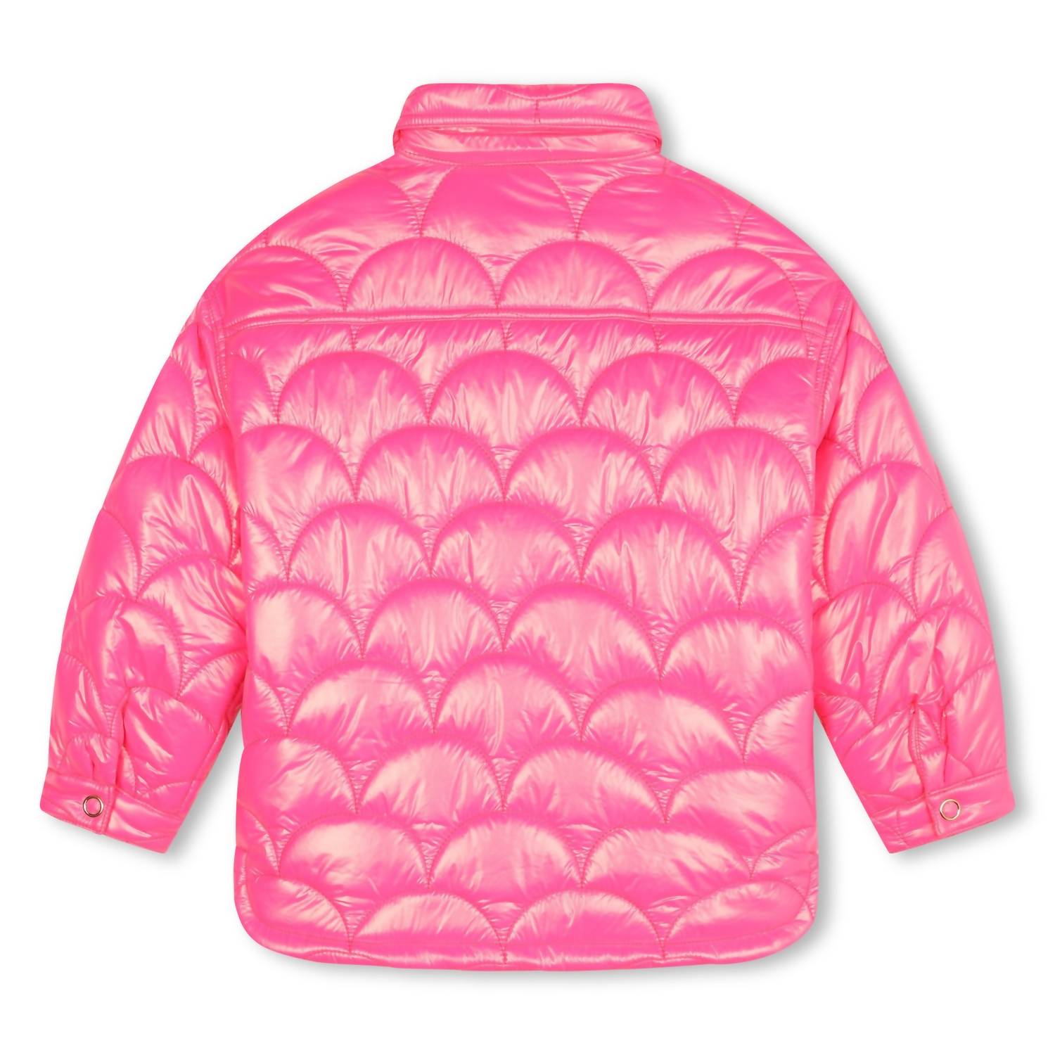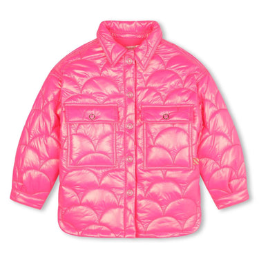 Introducing the Girl's Puffer Shirt Jacket by Billieblush, a chic layering essential for brisk fall days. This pink jacket showcases a shimmery finish with quilted heart details and is crafted from 100% Metalized Coating and 100% Polyamide. Featuring front pockets with snap closure, it combines functionality with style. Perfect for adding a pop of fun to any outfit.