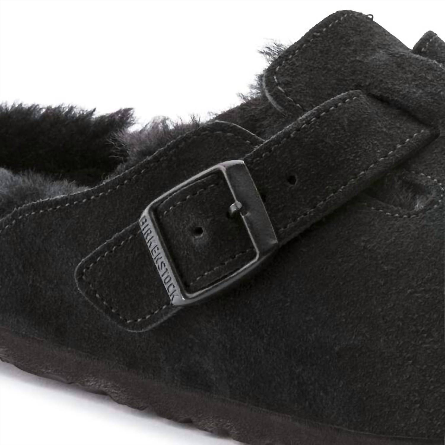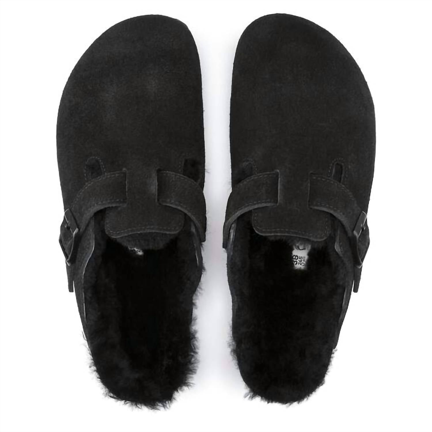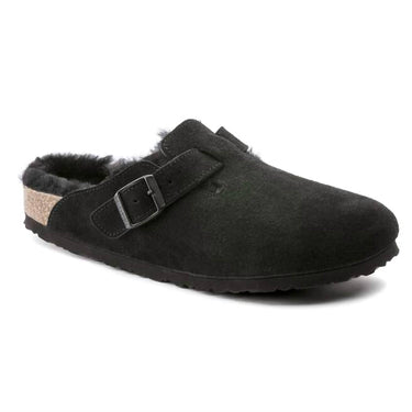 Step into warmth with the Men's Boston Shearling Clog by BIRKENSTOCK, a perfect blend of comfort and classic style. Crafted in Germany, these clogs feature a luxurious suede upper and genuine shearling insole, providing a velvety feel inside out. The anatomically formed cork footbed and flexible EVA outsole ensure supportive comfort with each step, while the adjustable strap with a metal pin buckle offers a secure fit. Available in timeless black, these clogs are designed for the colder months, making them an essential addition to your footwear collection.